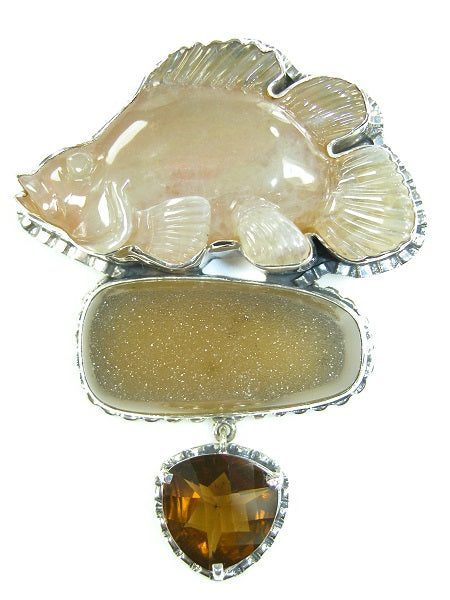 18265 Hand Carved Opal Fish Brazilian Drusy Agate Cognac Topaz Sterling Silver Pin Pendant