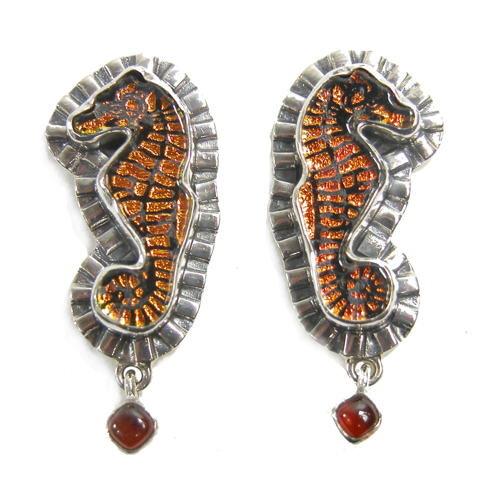 22665 Hessonite, Dichroic Glass, Seahorse Sterling Silver Earrings