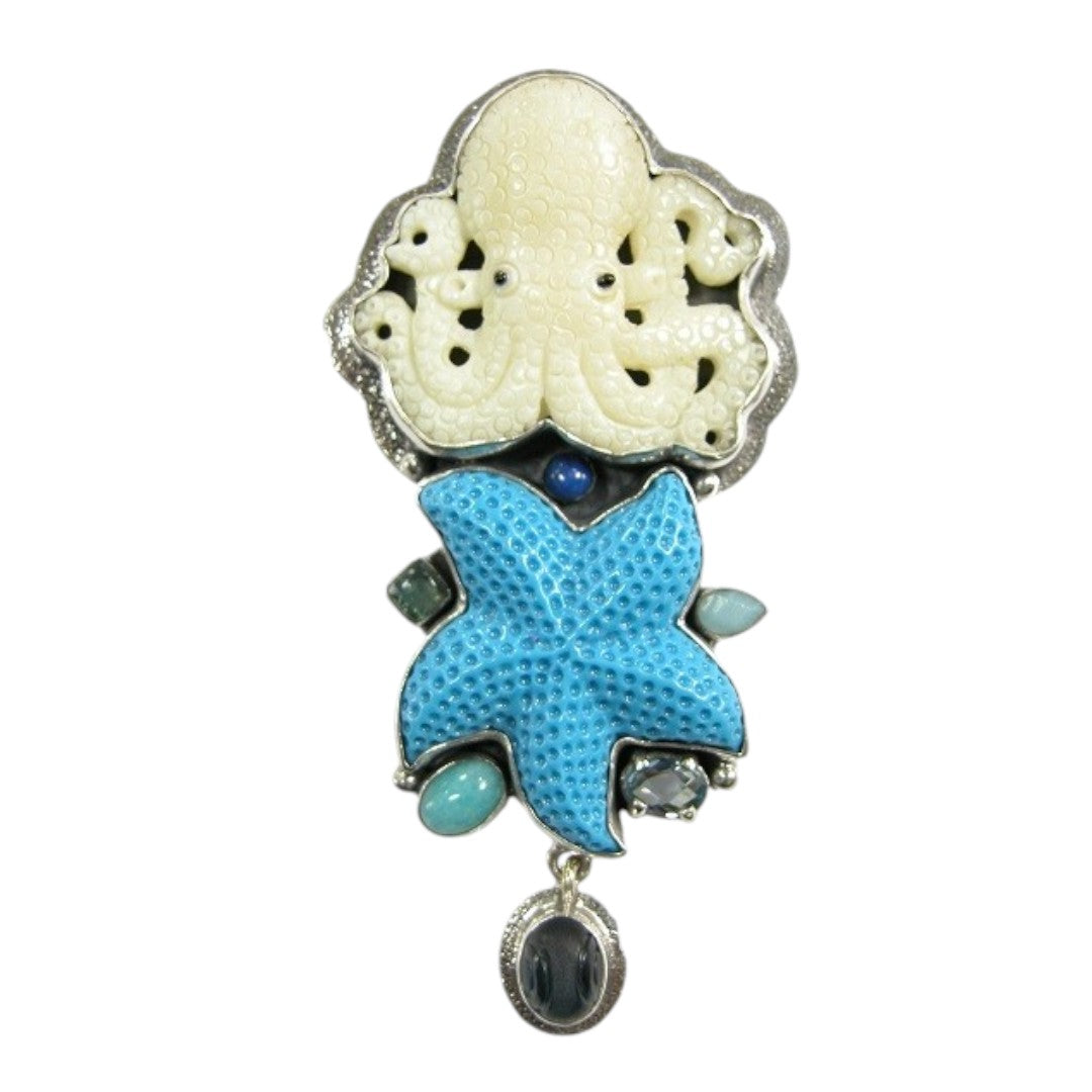 Life under the sea comes to life with this beautifully, hand carved bone octopus, a blue carved starfish, amazonite, lapis, and quartz stones, all set in sterling silver, with sterling silver accents. This pin pendant is a great addition to any wardrobe, and can be worn as a pin, or as a pendant on beads, chains, etc.
