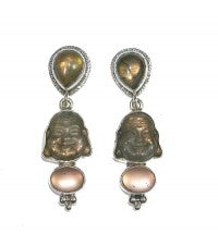 Labradorite and celestial quartz Buddha drop earrings set in sterling silver. Available in post only.
