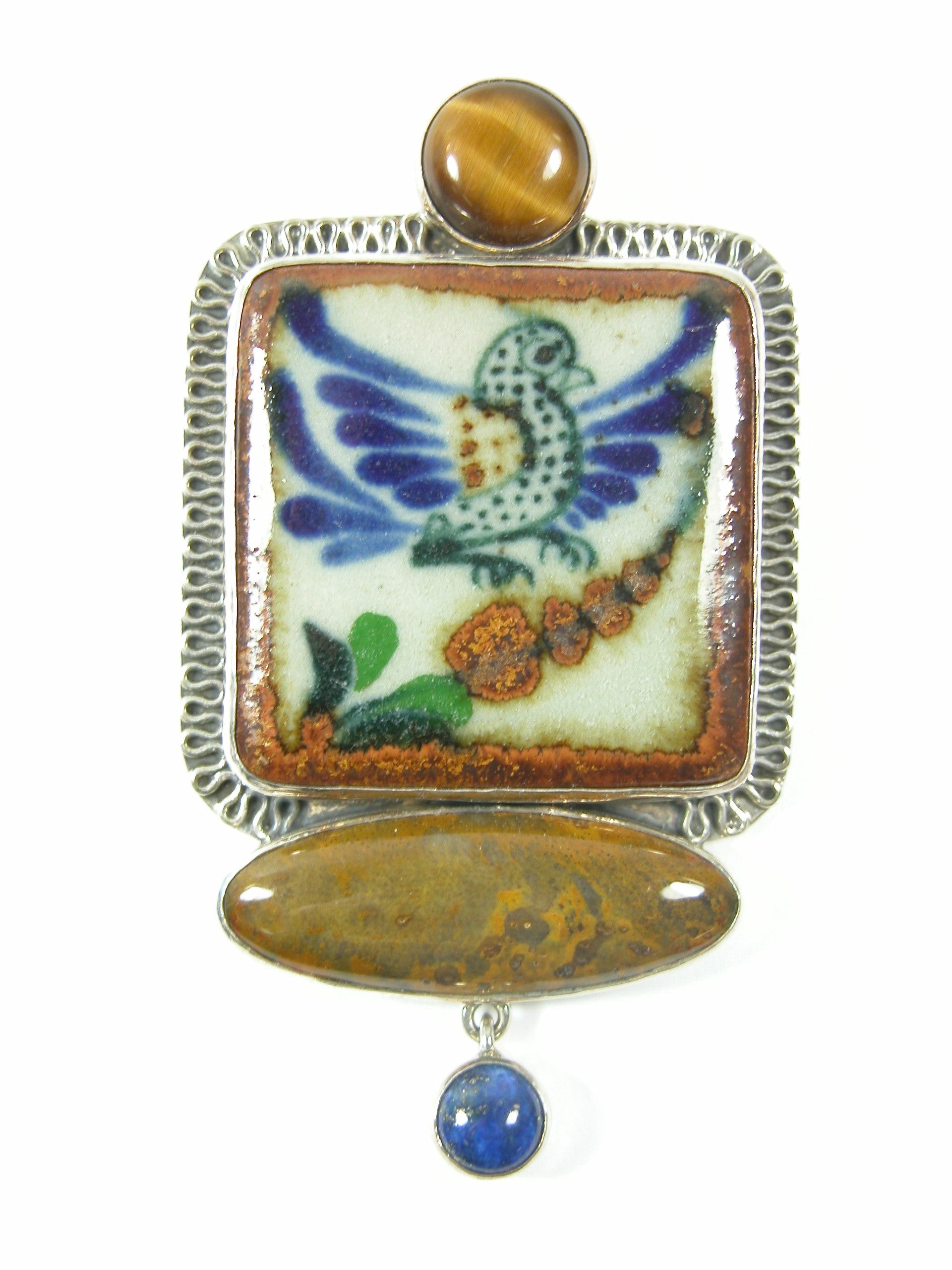 This warm pin pendant has a hand painted bird tile, with lapis, tiger's eye and jasper stones, all set in sterling silver. This piece can be worn as a pin, or as a pendant on chains, beads, etc.