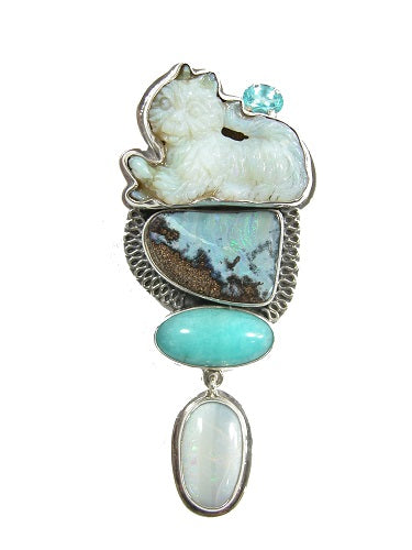 This one of a kind pin pendant is a gorgeous item, and contains a carved opal cat, faceted apatite, boulder opal, australian opal, and smooth amazonite stones. All of these stunning stones are all perfectly set in shimmering sterling silver. This wonderful item can be worn as a pin, or as a pendant on chains, beads, etc.