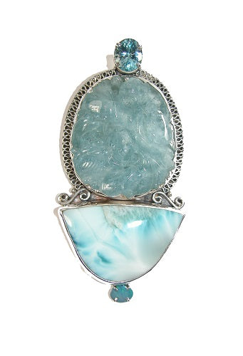 Carved Aquamarine Opal Larimar Sterling Silver Pin Pendant
