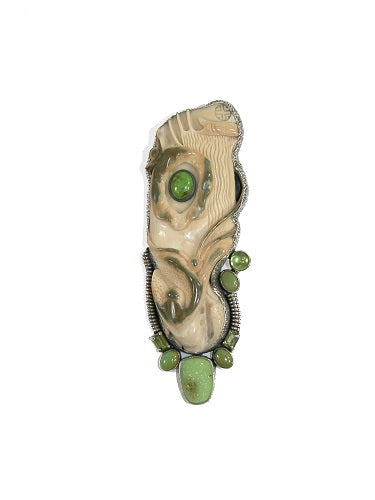 This linear piece draws you in with all the fine details. A hand carved piece of mammoth ivory has been embellished with green turquoise and peridot, green natural drusy agate stones, all set in sterling silver. This piece can be worn as a pin, or as a removable pendant on chain, beads, etc.