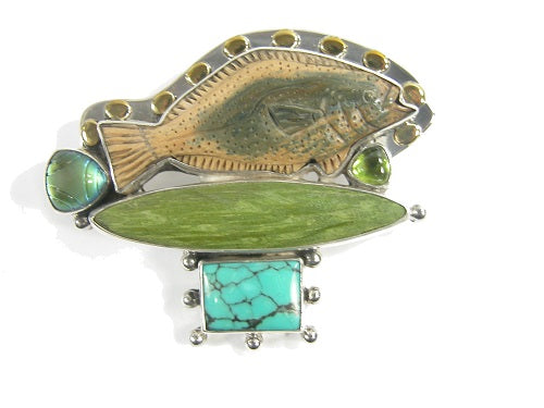 This hand carved ivory fish sits atop green wood, turquoise, vesuvianite and quartz stones, all set in sterling silver. This piece can be worn as a pin, or as a pendant on chain, beads, etc.