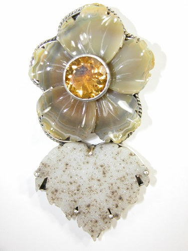 Carved Agate Flower Druzy Citrine Sterling Silver Pin and Pendant