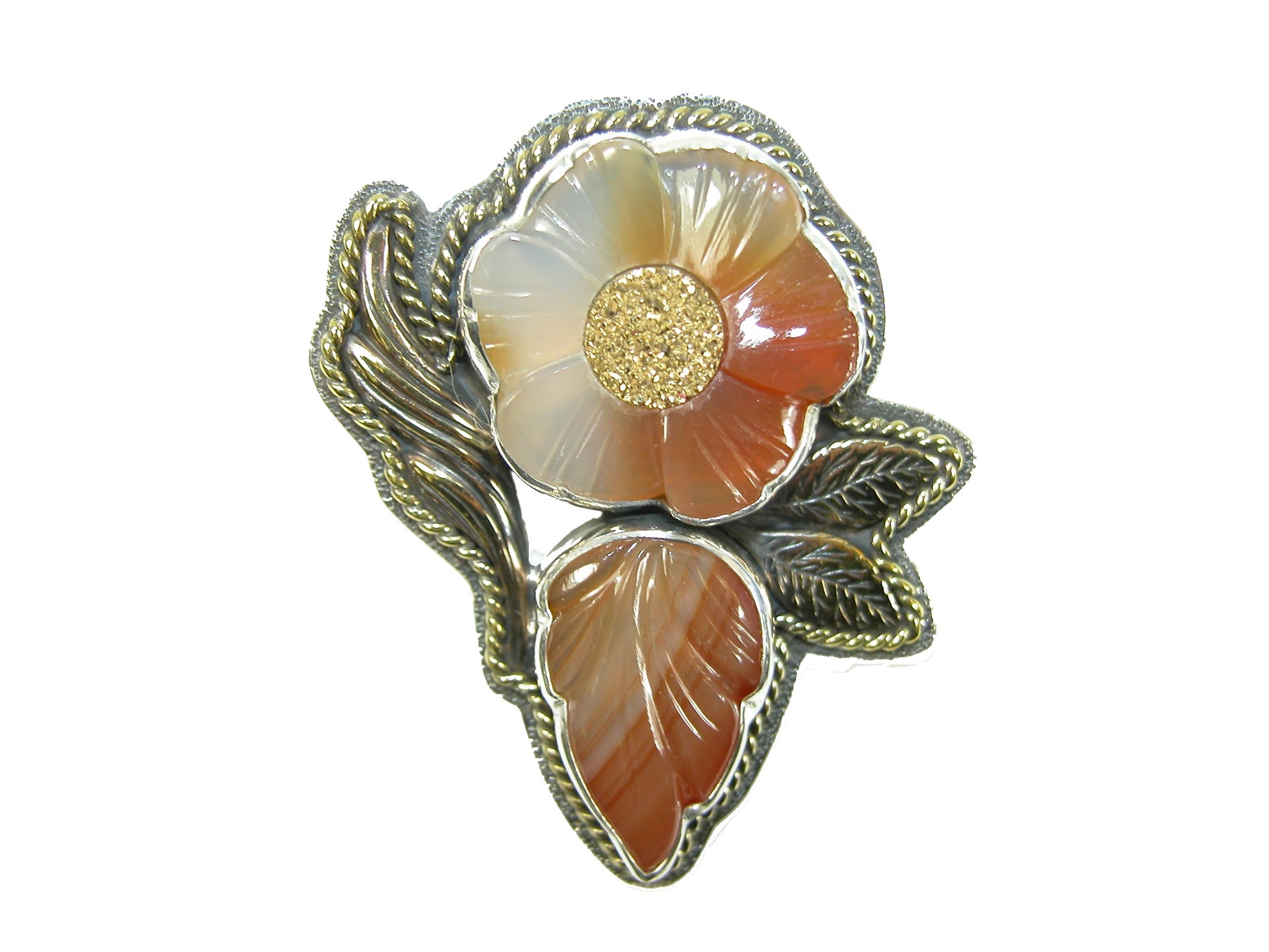 29170 Flower Carved Carnelian, Gold Clad Druzy Agate, Sterling Silver Pin and Pendant