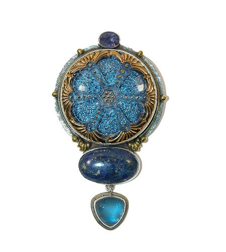 This stunning pin pendant shines with its blue hues, and contains a vintage glass button, smooth lapis, celestial quartz, and faceted iolite stones all set in sterling silver. This wonderful item is a fantastic accessory, and will make a great addition to your pin pendant collection. This item can be worn as a pin, or as a pendant on chains, beads, etc.