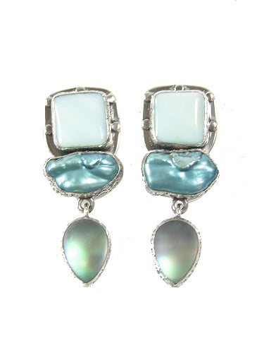 These earrings are a harmonious combination of blues with larimar, blue freshwater pearls and abalone under frosted quartz stones, all set in sterling silver. These are available in post or clip backs.