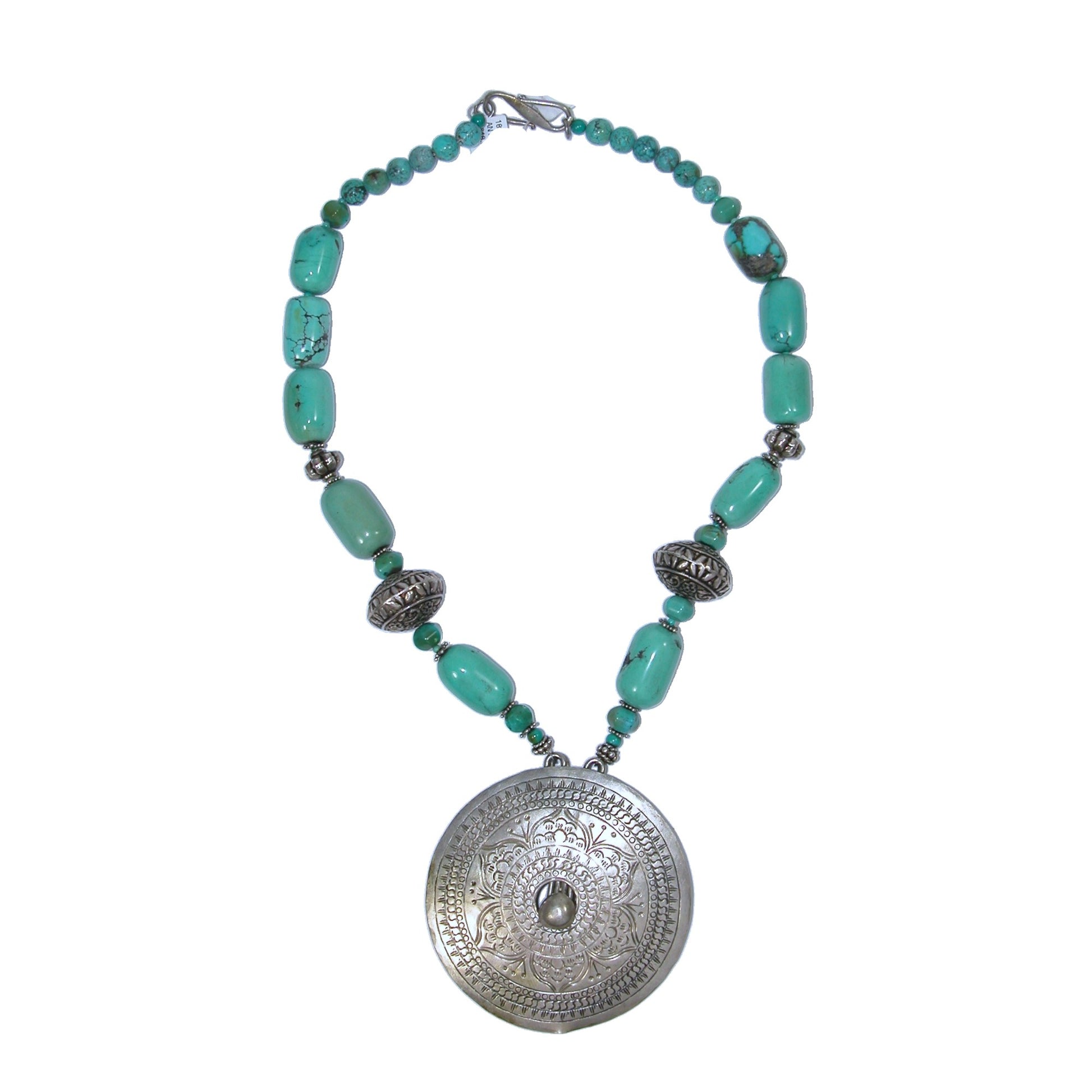18226 Antique Pendant, Turquoise Beaded Sterling Silver Necklace