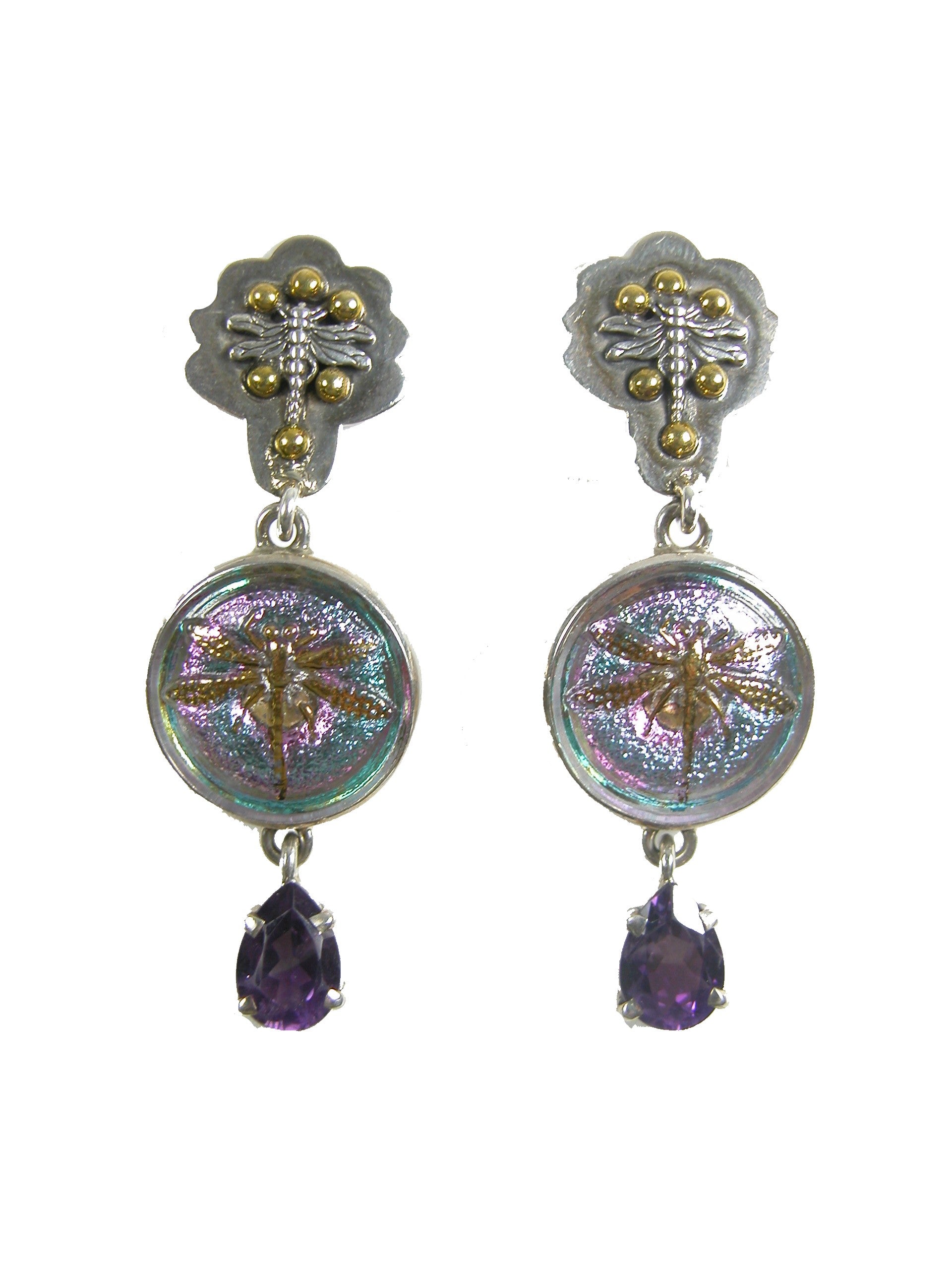 Amethyst, Czech Glass Button, Sterling Silver Earrings