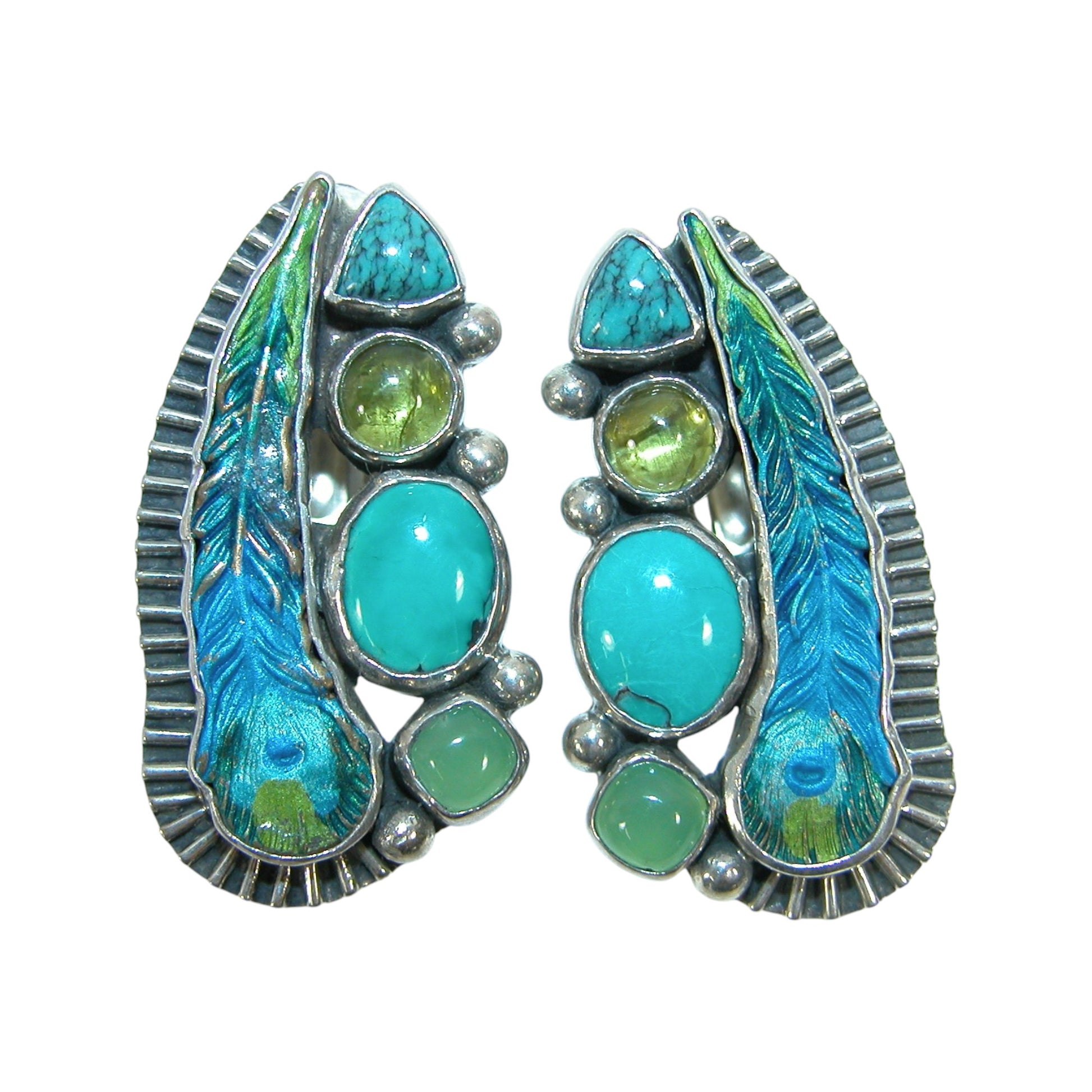 31709 Hand Enameling Feather, Peridot, Turquoise Sterling Silver Earrings