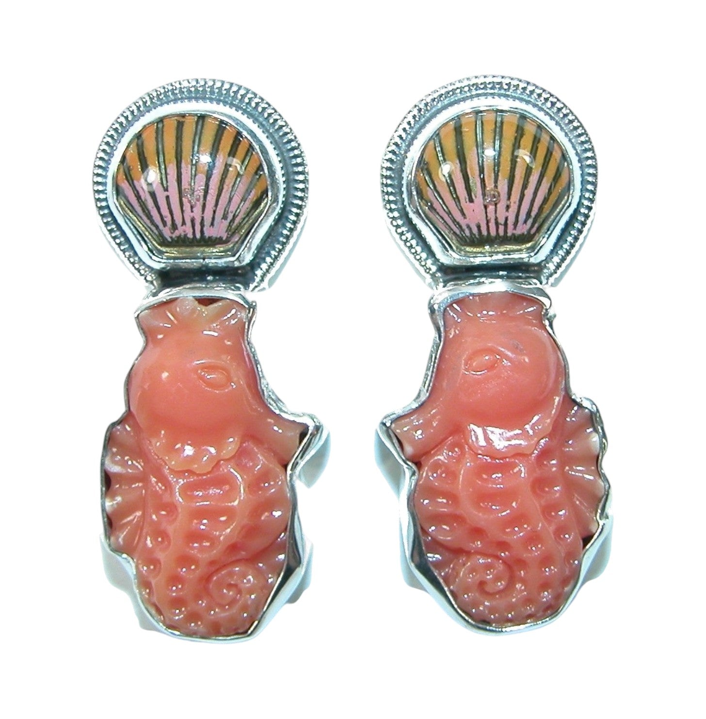 32005 Hand Carved Seahorse, Hand Enameling Seashell Sterling Silver Earrings
