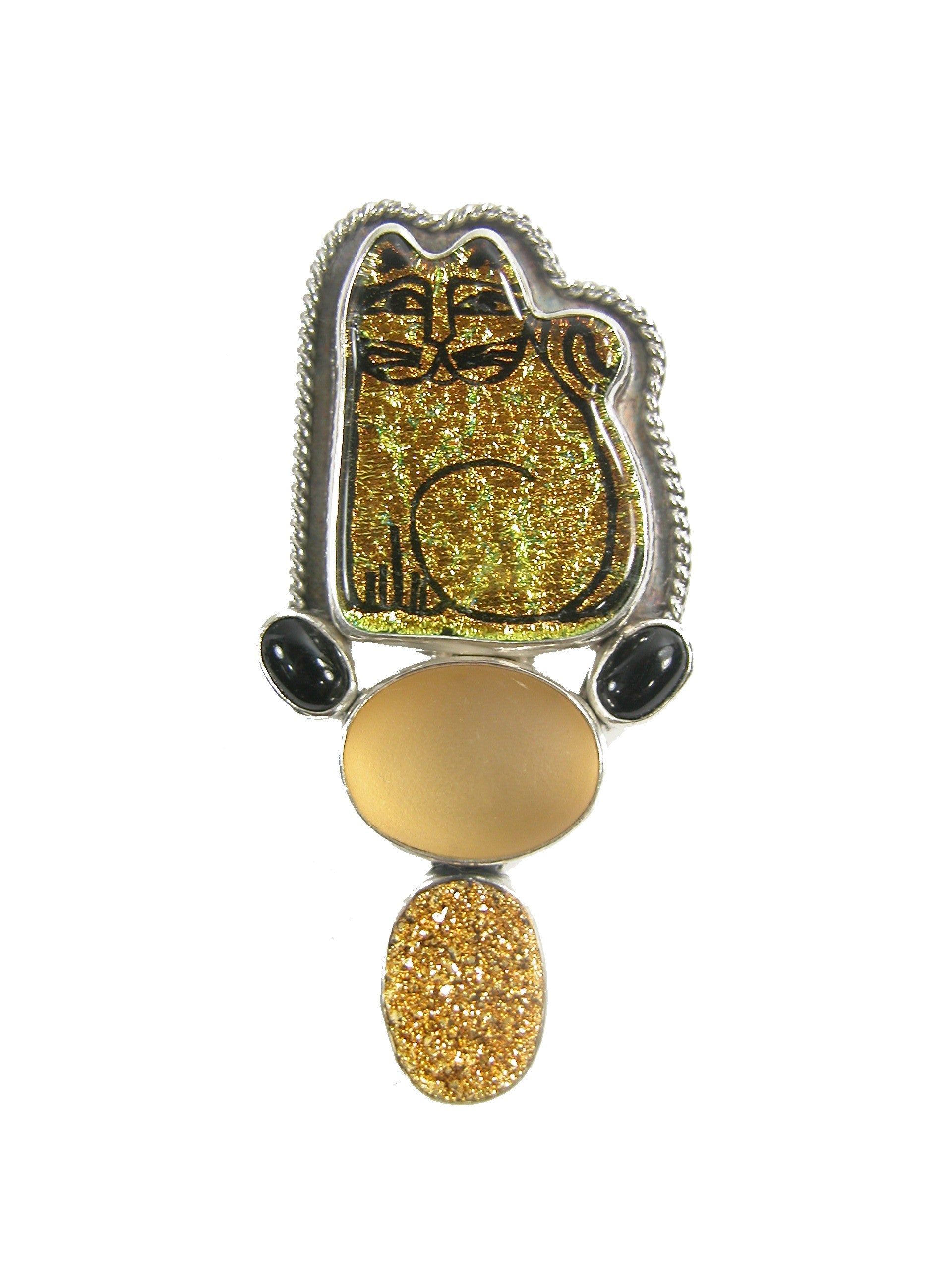 22662 Dichroic Glass, Gold Clad Drusy, Gold Under Quartz, Black Onyx Sterling Silver Pin Pendant