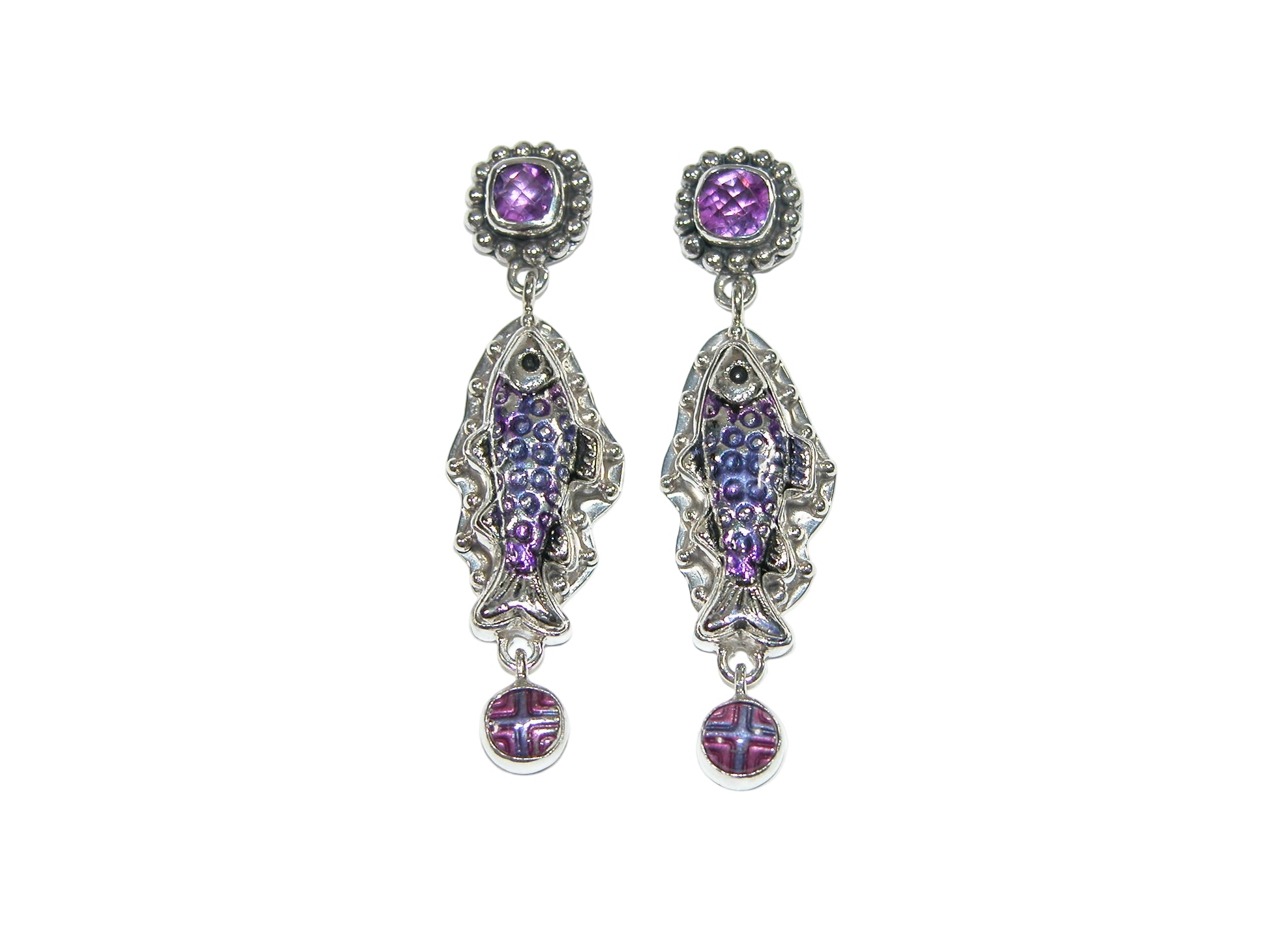 32817B Amethyst Hand Enameled Dangling Fish Sterling Silver Earrings