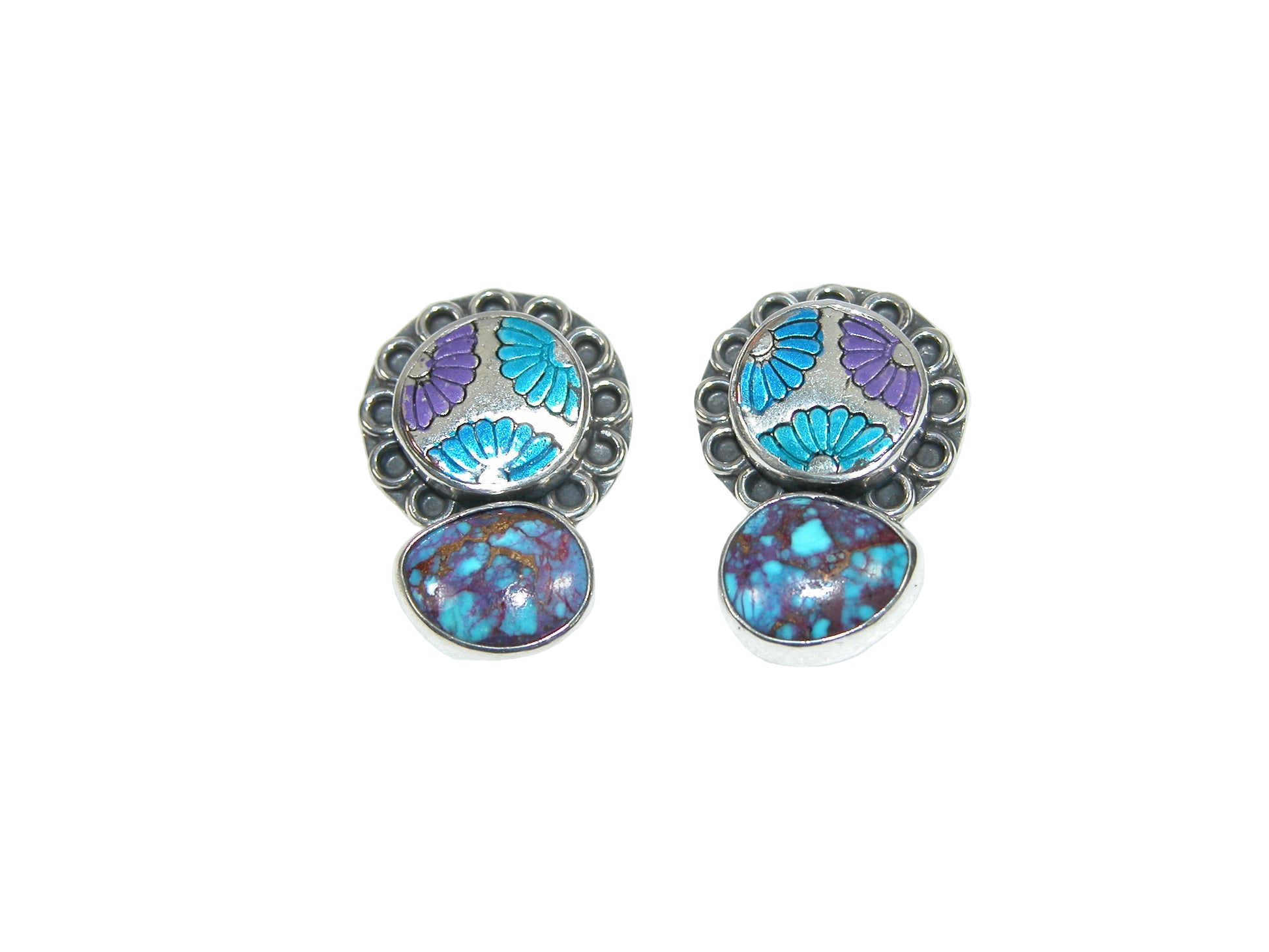 33041 Purple Turquoise Flower Enamel, Sterling Silver Earrings