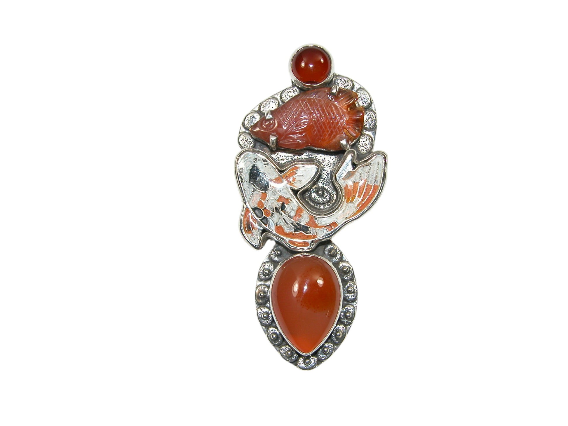 33174 Hand Enameled, Carnelian, Sterling Silver Fish Pin and Pendant