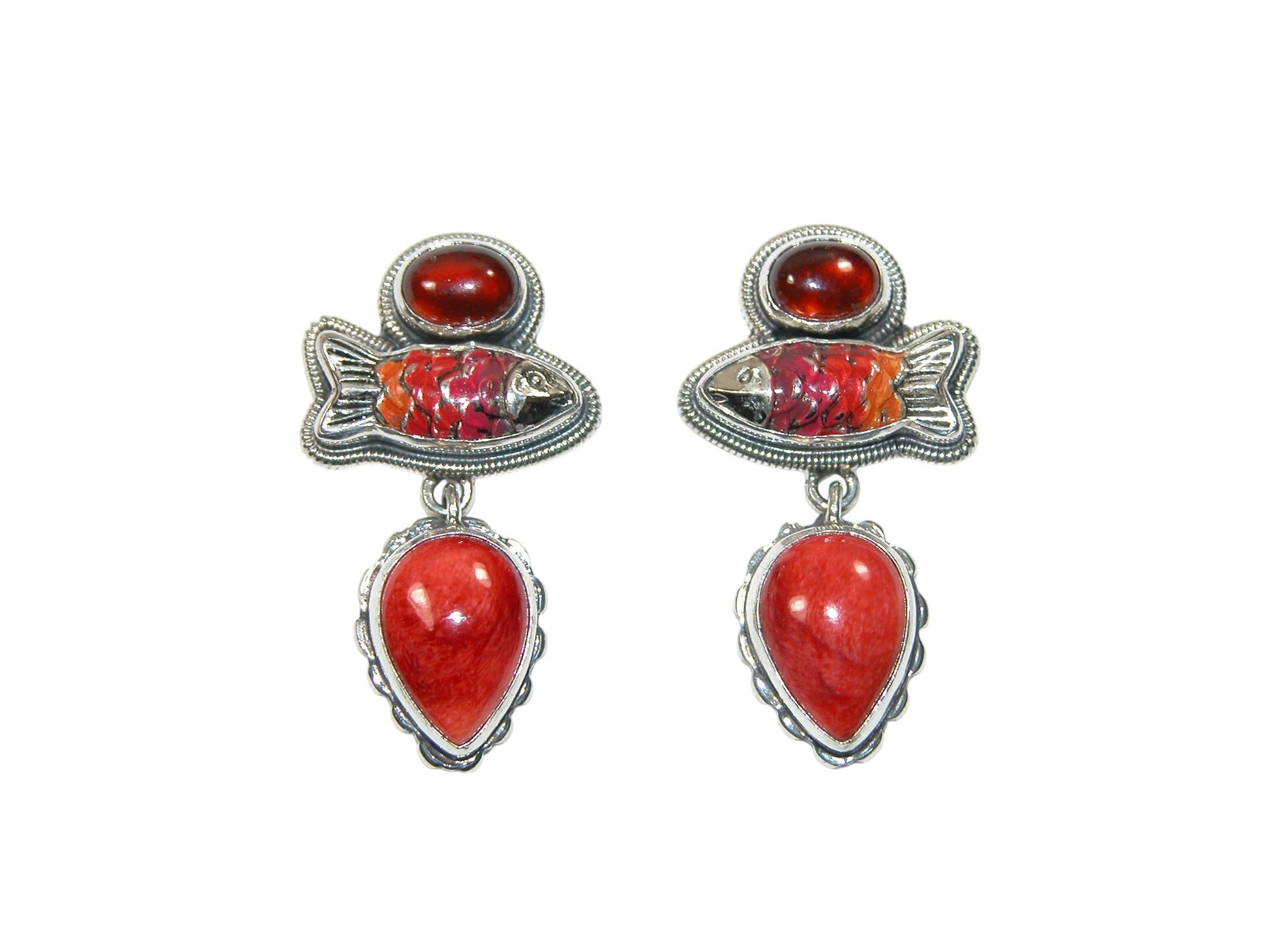 33253 Enameled Fish, Spiny Oyster, Amber, Sterling Silver Earrings