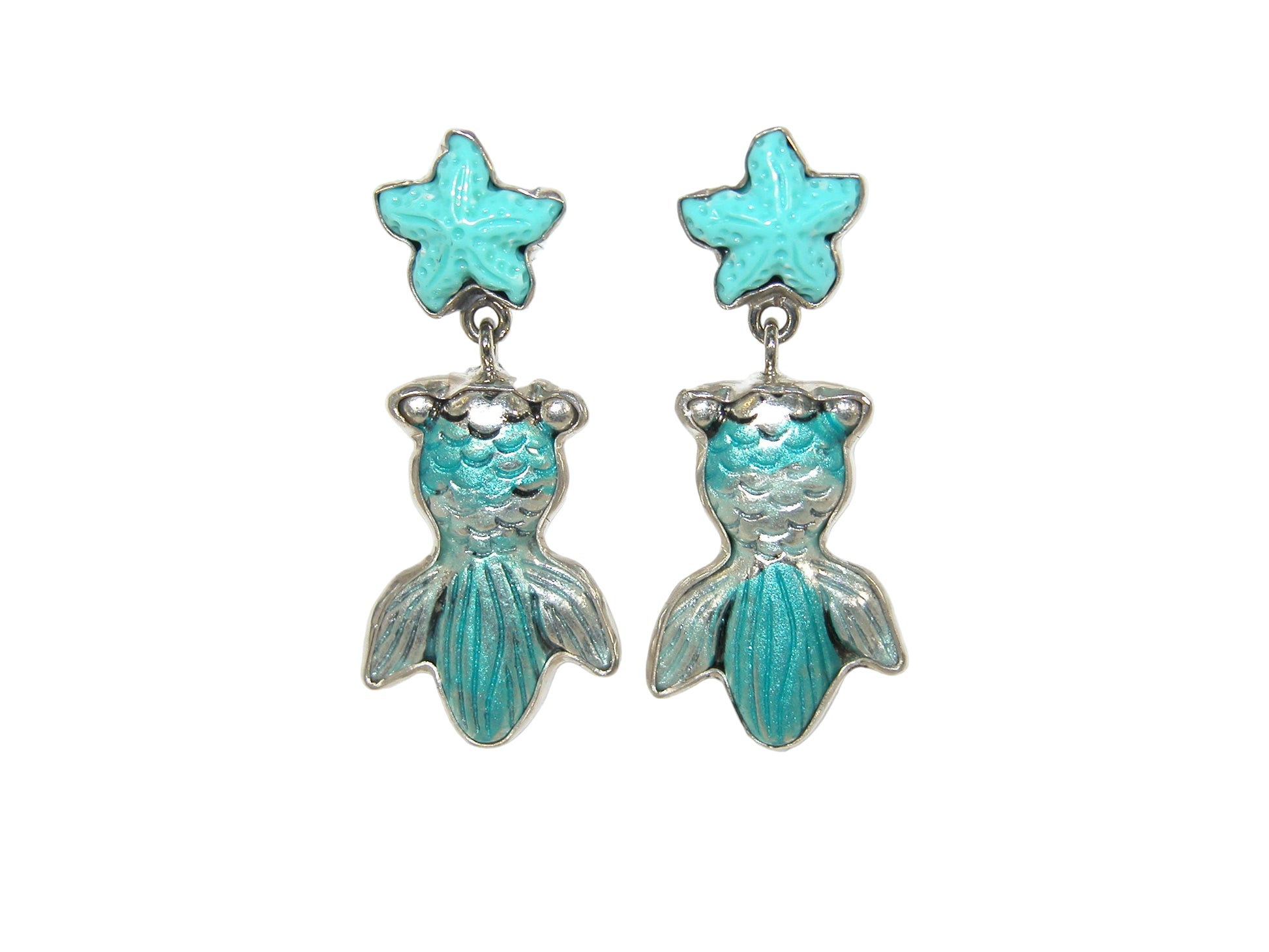 33433 Hand Enameled Fish, Turquoise Carved Starfish, Sterling Silver Earrings