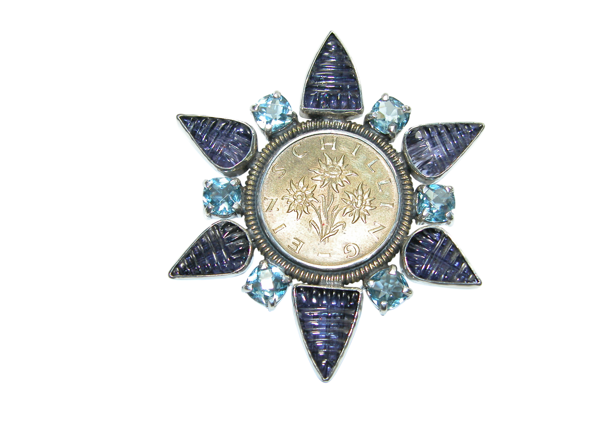 34034 Iolite, Blue Topaz, Vintage Gold Coin Pin Pendant