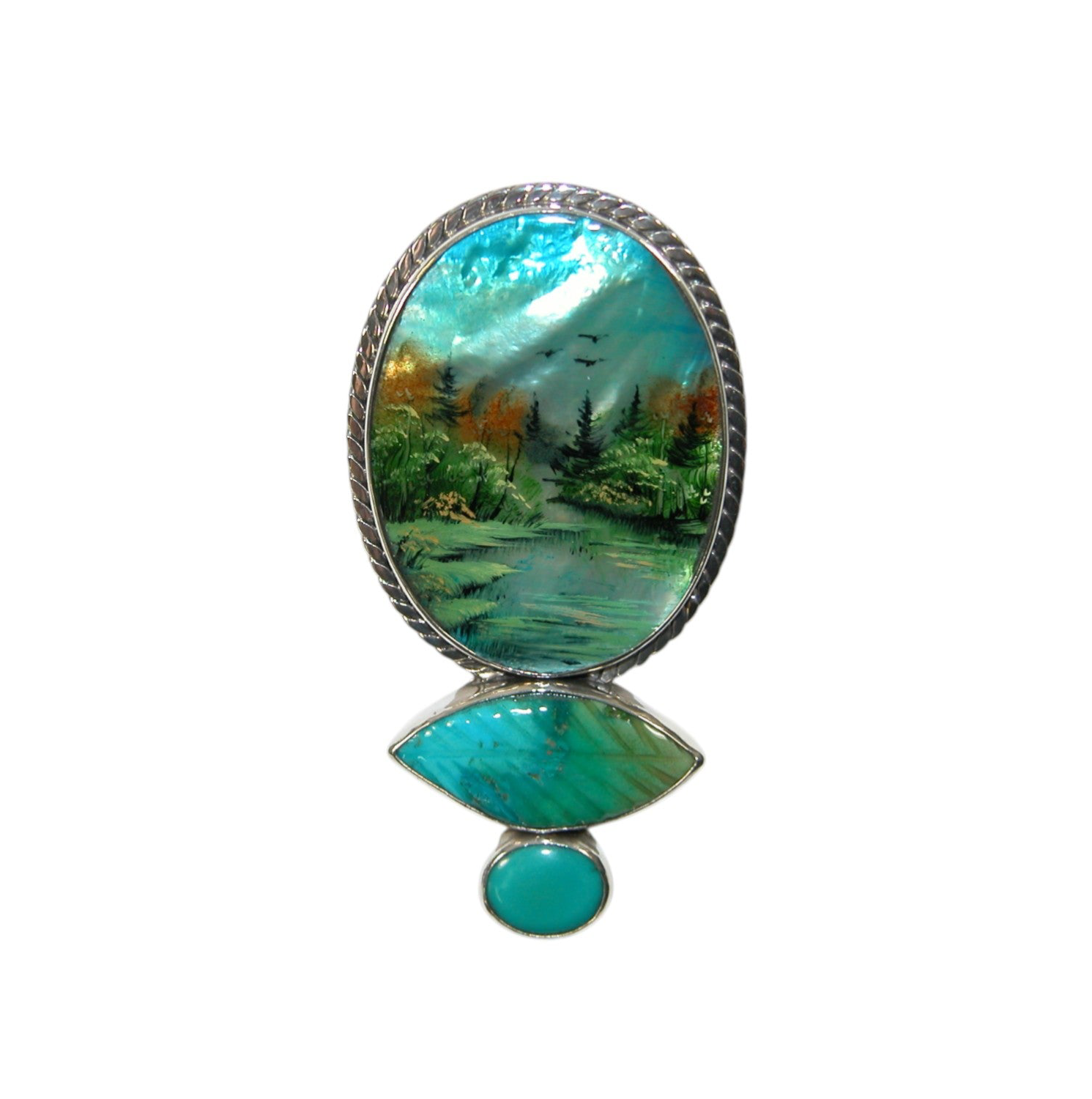 34184 Hand Painted Mother of Pearl Landscape, Turquoise, Pin & Pendant