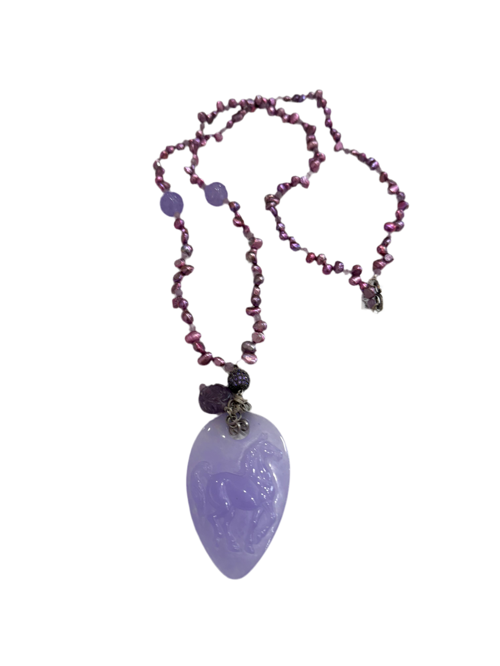 5805 Jade Carved Horse Freshwater Pearl Sterling Silver Necklace