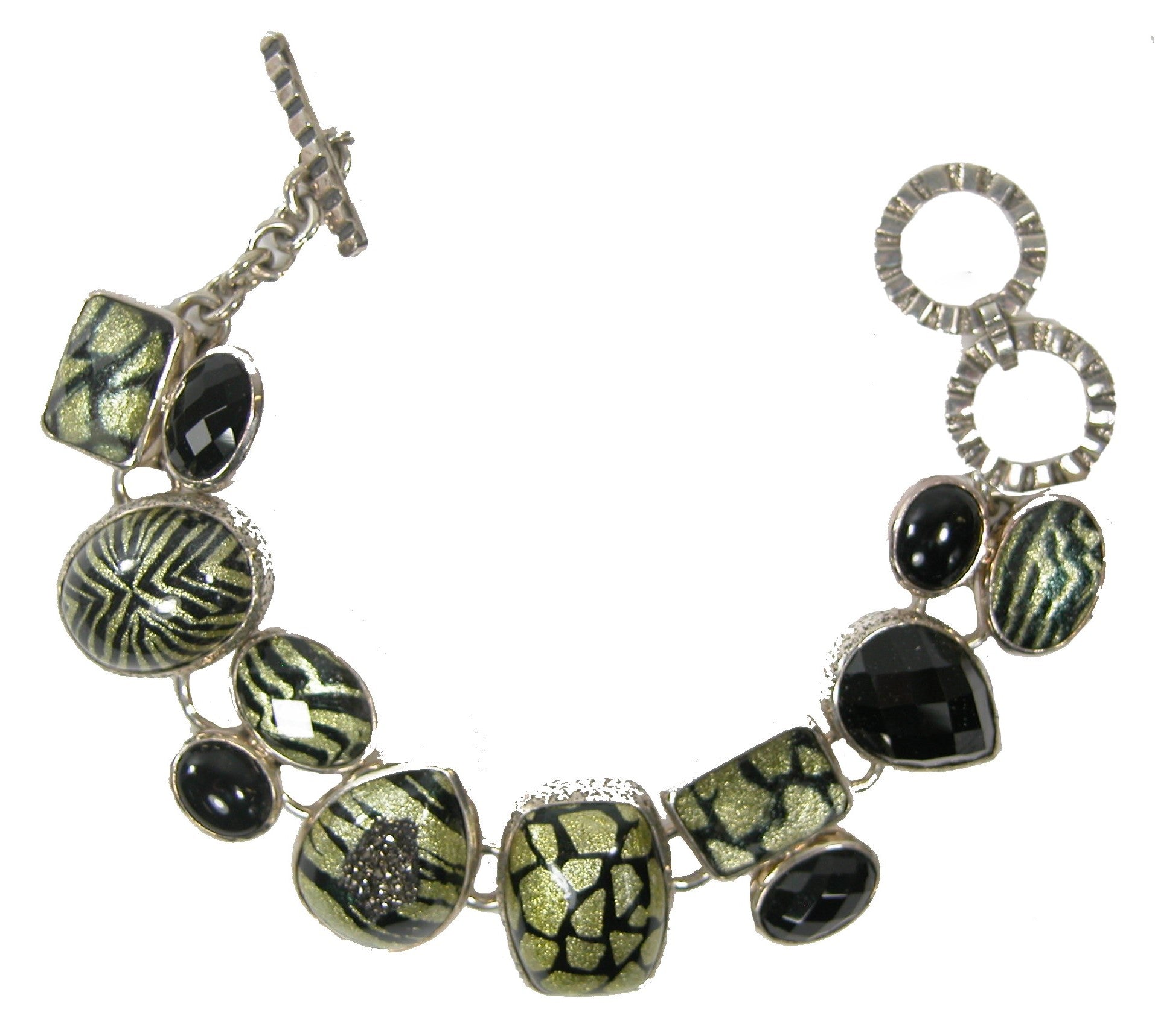 Sleek, animal print toggle clasp bracelet. Enamel under quartz, drusy and black onyx set in sterling silver.
