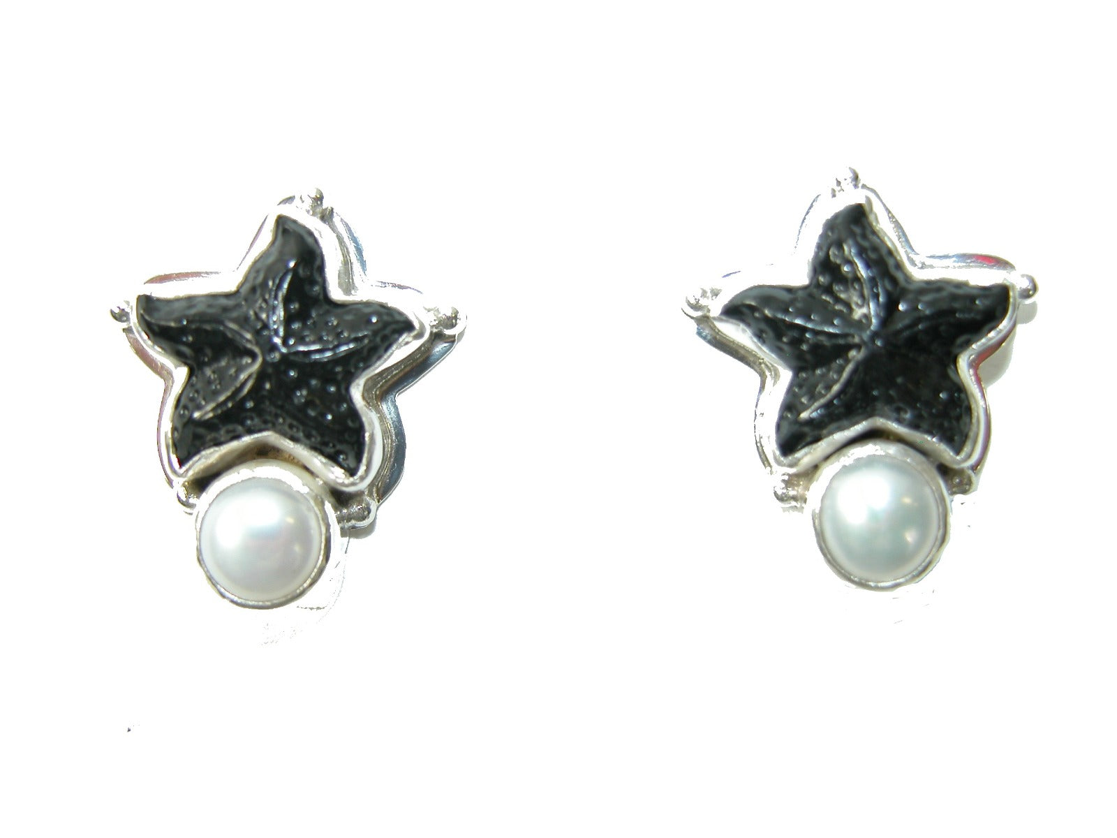 29555 Black Star Fish with Freshwater Pearl Sterling Silver Earring