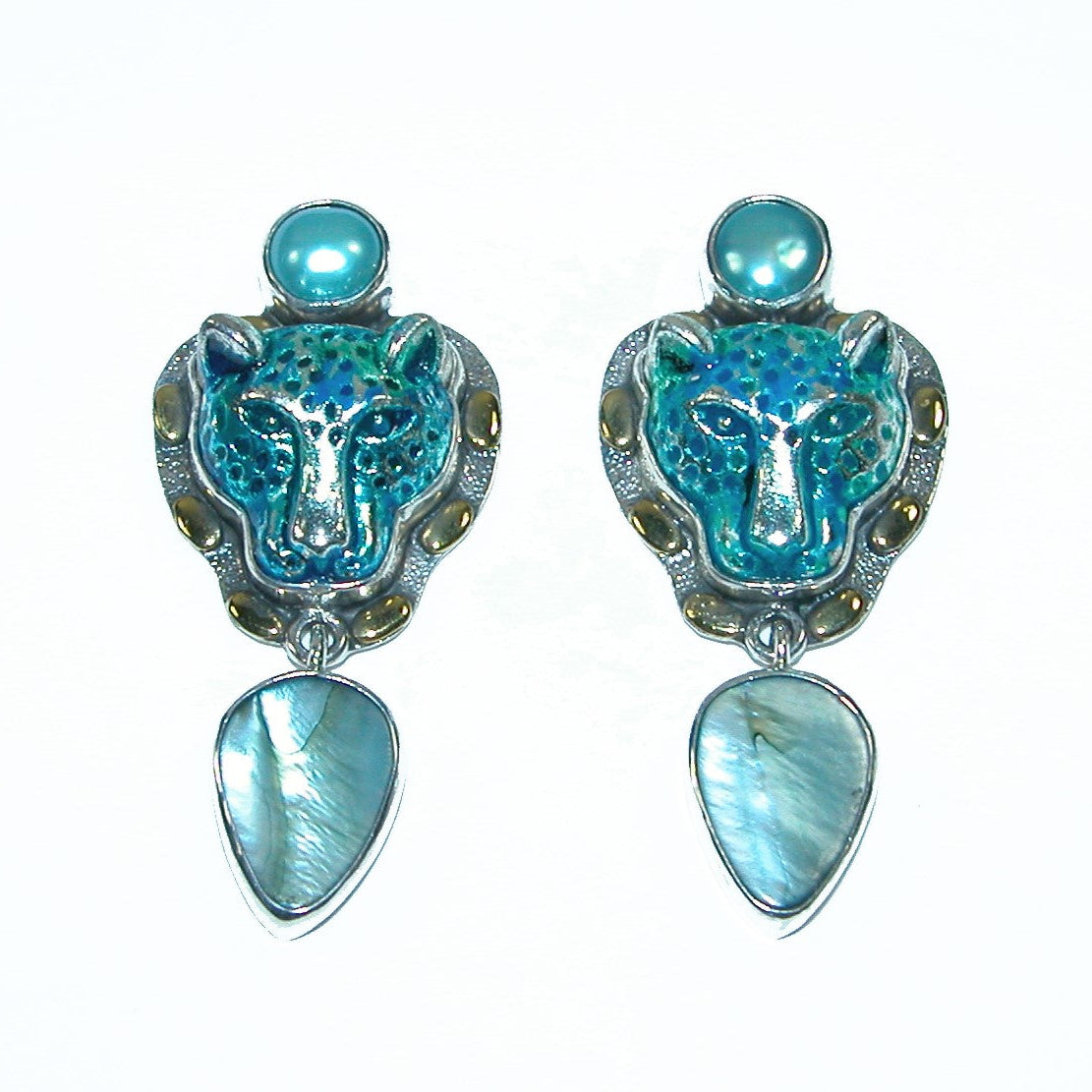 31784 Hand Enameled Tiger Freshwater Pearl Sterling Silver Earrings