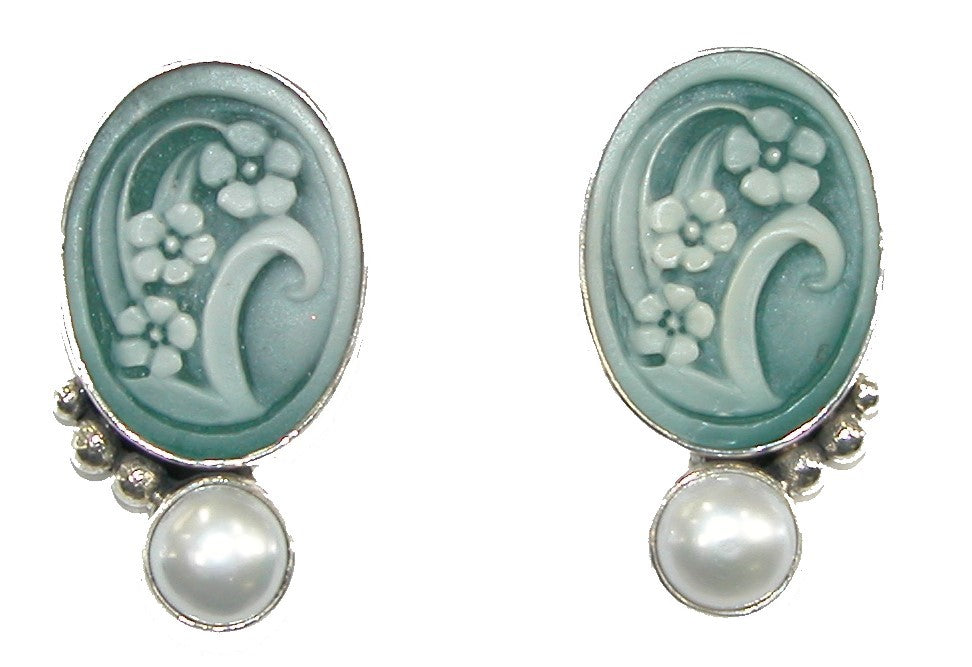 19744 Teal Floral Cameo and Freshwater Pearls with Sterling Silver Earrings