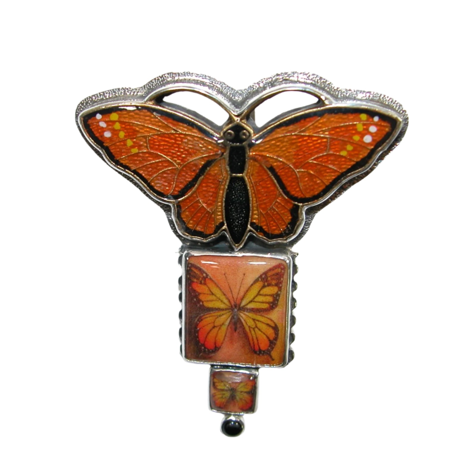 33044 Black Onyx, Hand Made Tile, Enameled Butterfly Sterling Silver Pin and Pendant