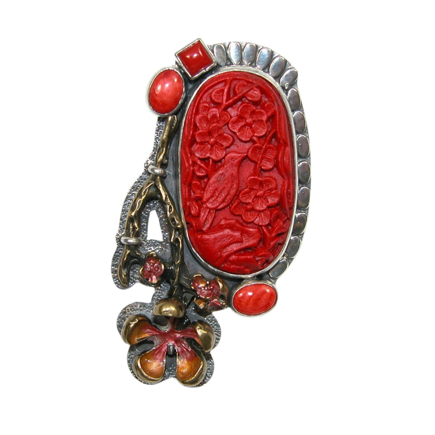 Carved Floral Hand Enamel Sterling Silver Pin and Pendant