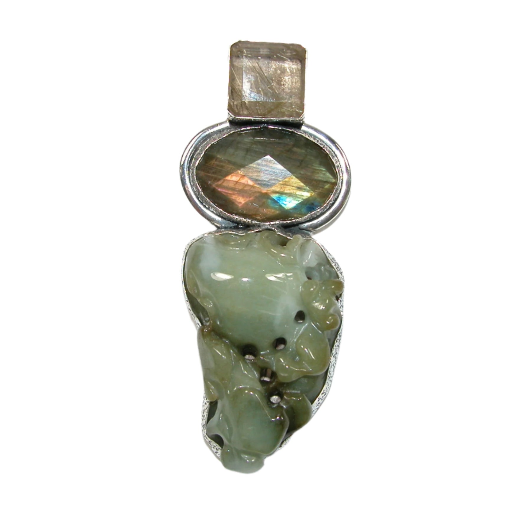 Carved Frog Labradorite Quartz Sterling Silver Pin and Pendant