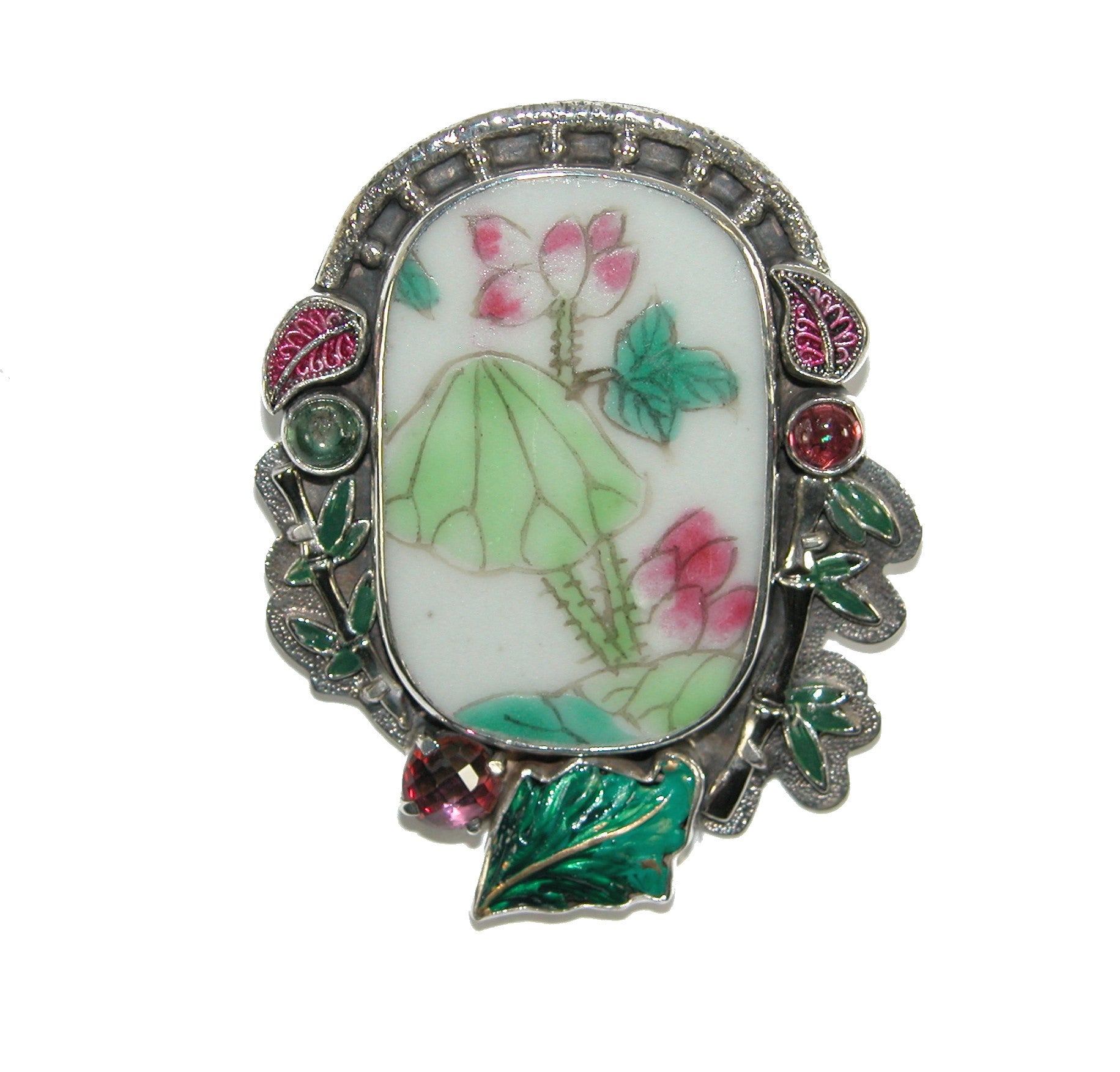 Porcelain Floral Tourmaline Hand Painted Enamel Sterling Silver Pin and Pendant