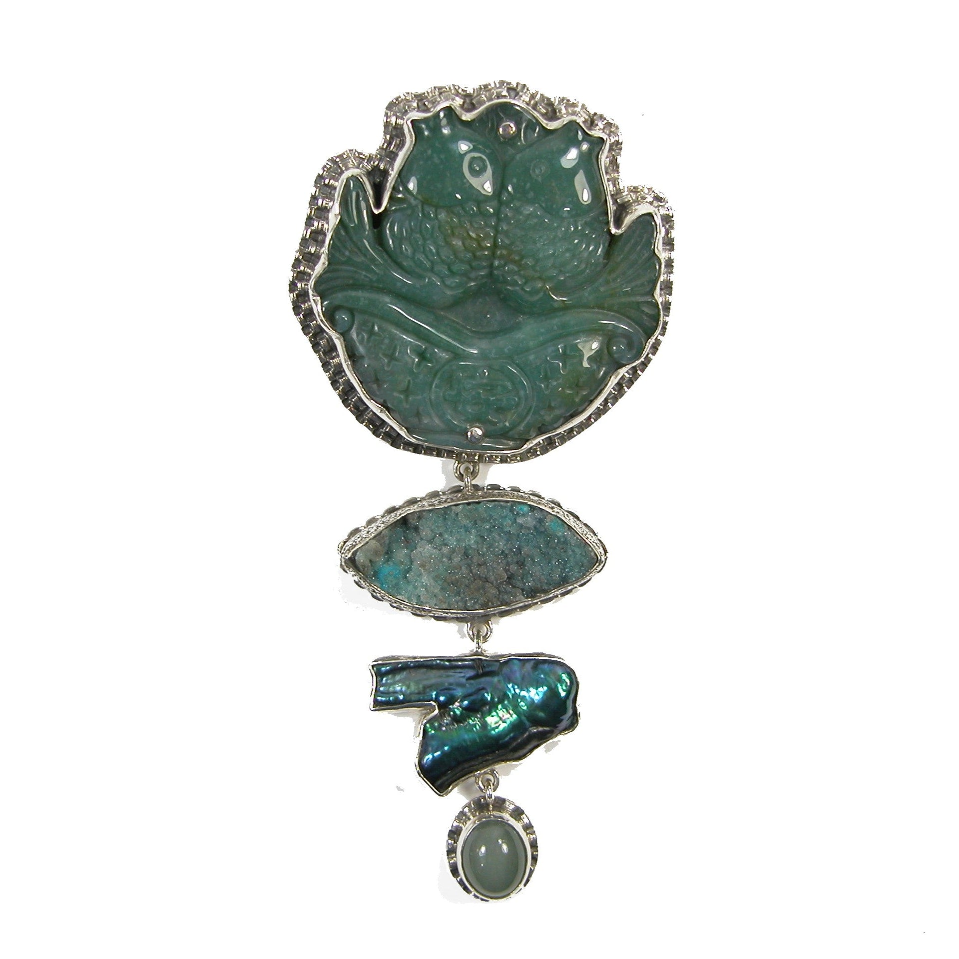 22856 Carved Jade Fish, Pearl Sterling Silver Pin and Pendant