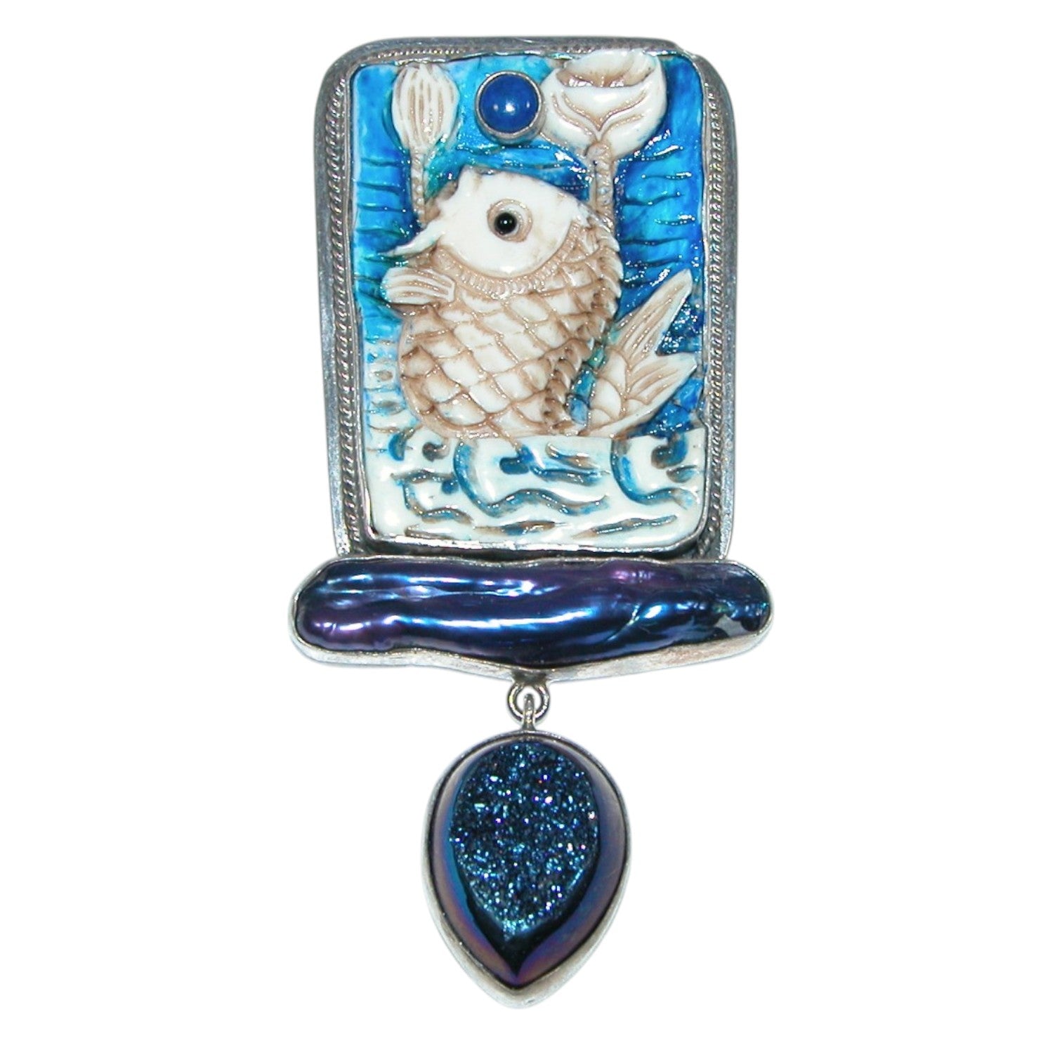 Hand Carved Fish Fossil, Freshwater Pearl, Druzy Sterling Silver Pin and Pendant