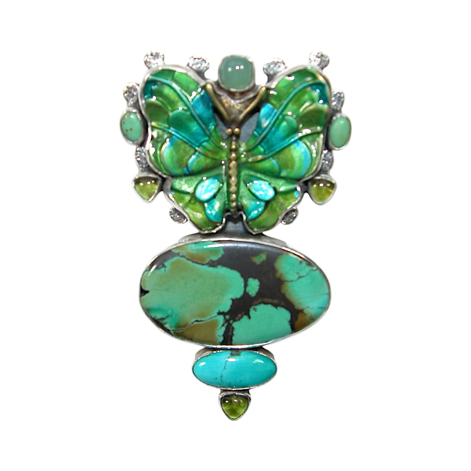 Hand Enamel Butterfly, Turquoise Sterling Silver Pin and Pendant
