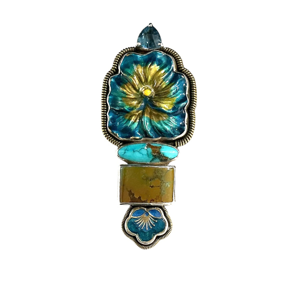 30486 Hand Enamel Flower, Turquoise Sterling Silver Pin Pendant