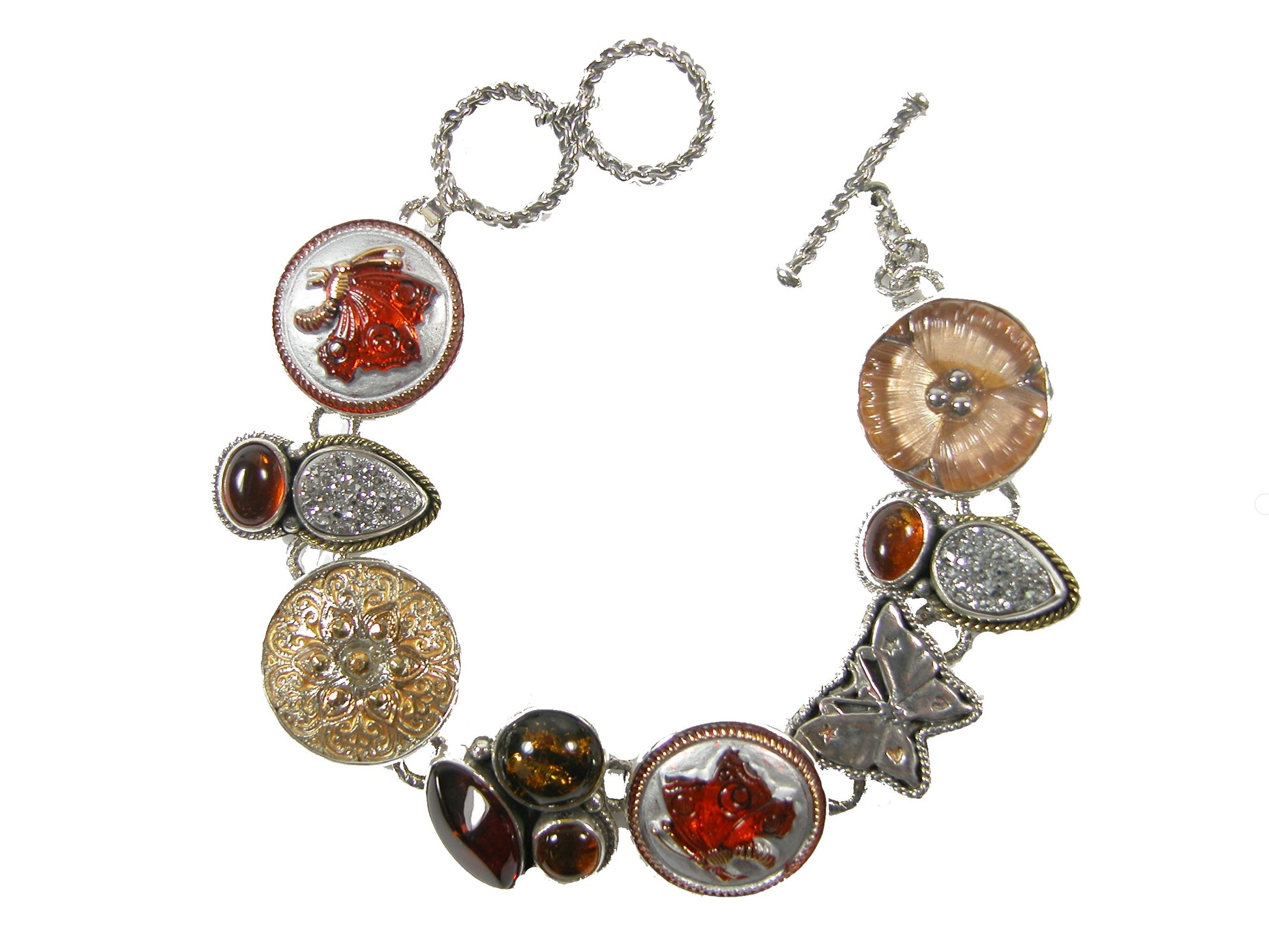 Drusy Amber Hessonite Butterfly Vintage Glass Sterling Silver Bracelet