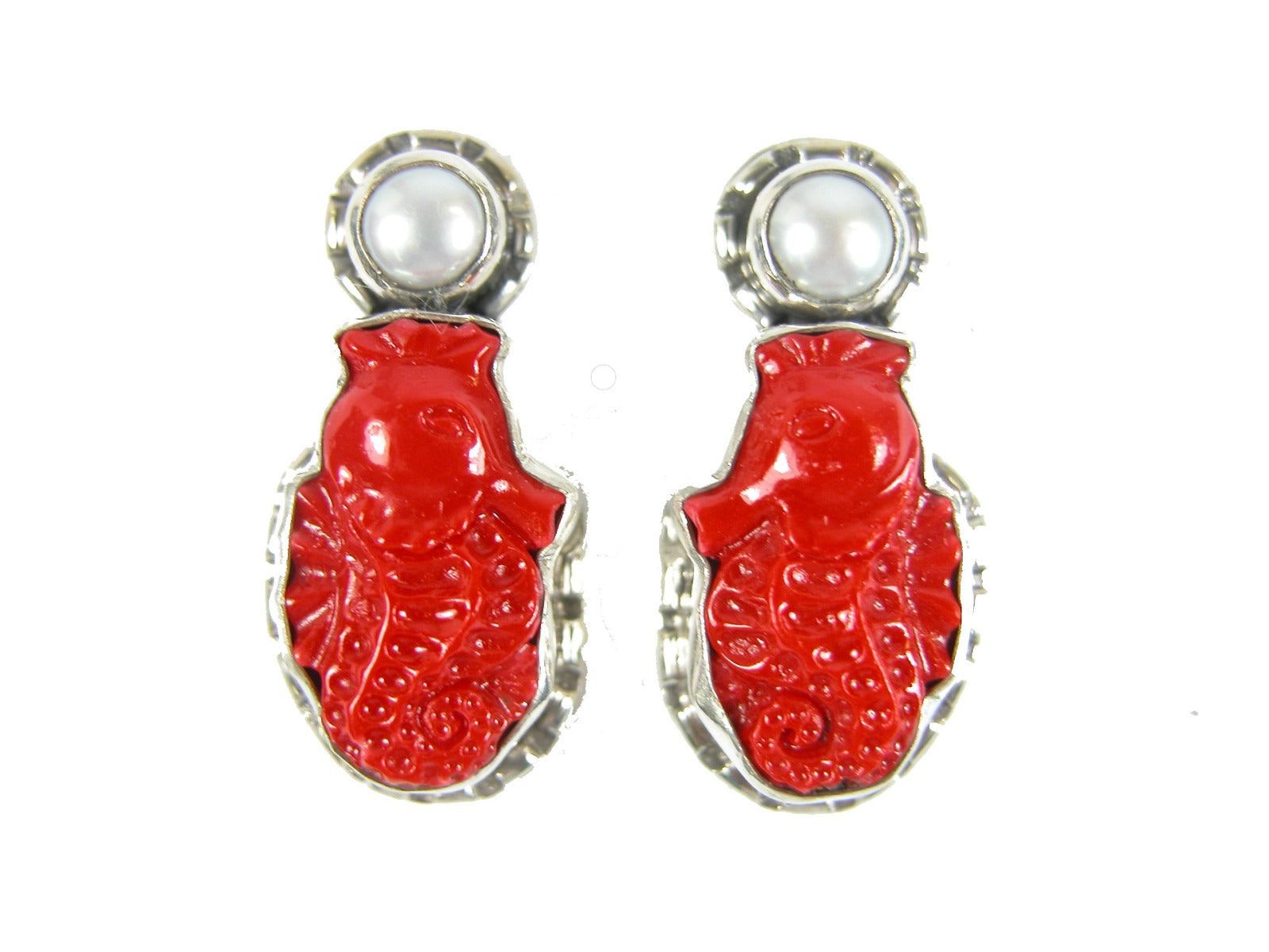 31026 Freshwater Pearl Red Seahorse Sterling Silver Earring