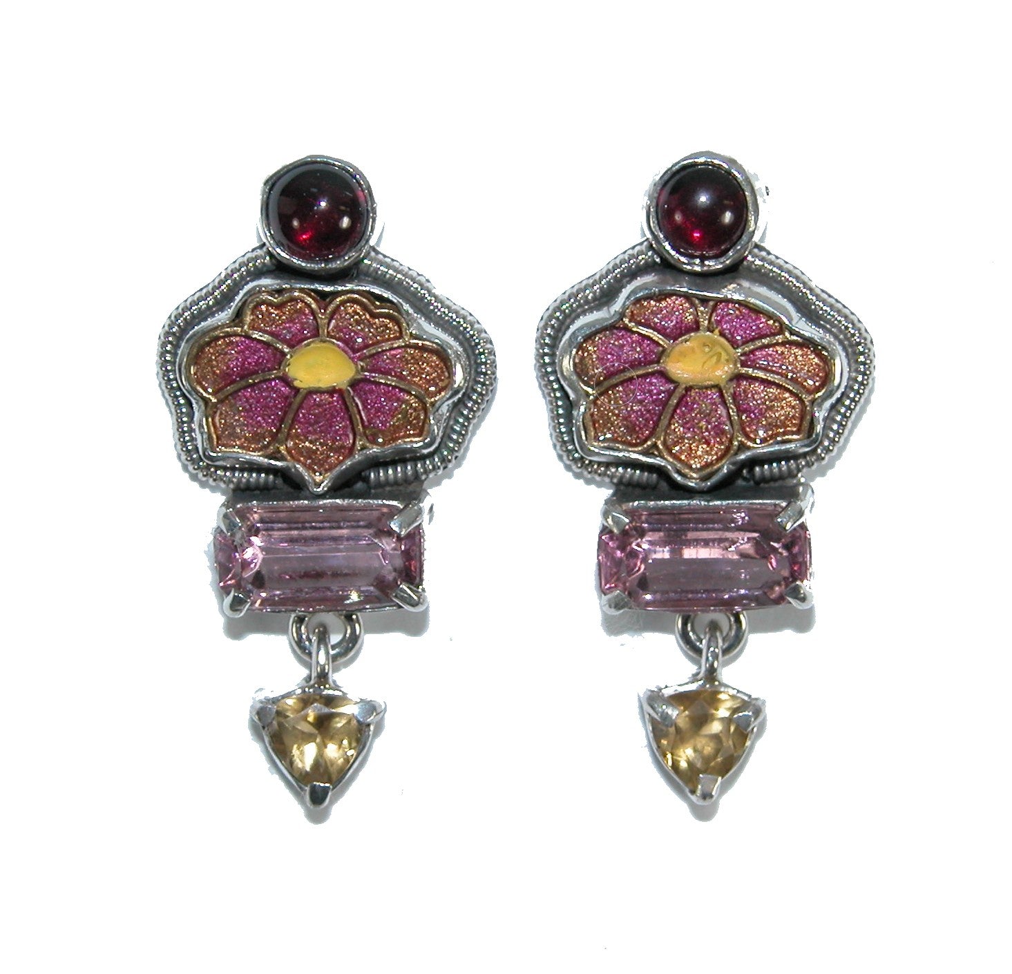 31211 Garnet Citrine Glass Flower Sterling Silver Earrings