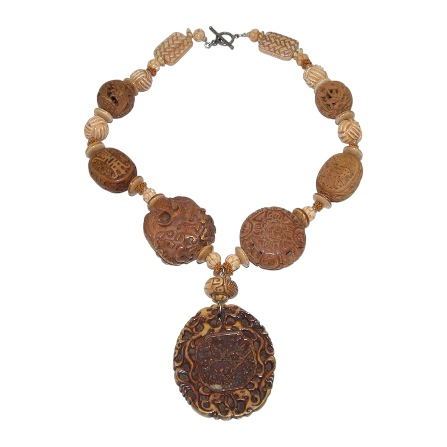 17134 Hand Carved Wooden Amulet Beaded Sterling Silver Necklace