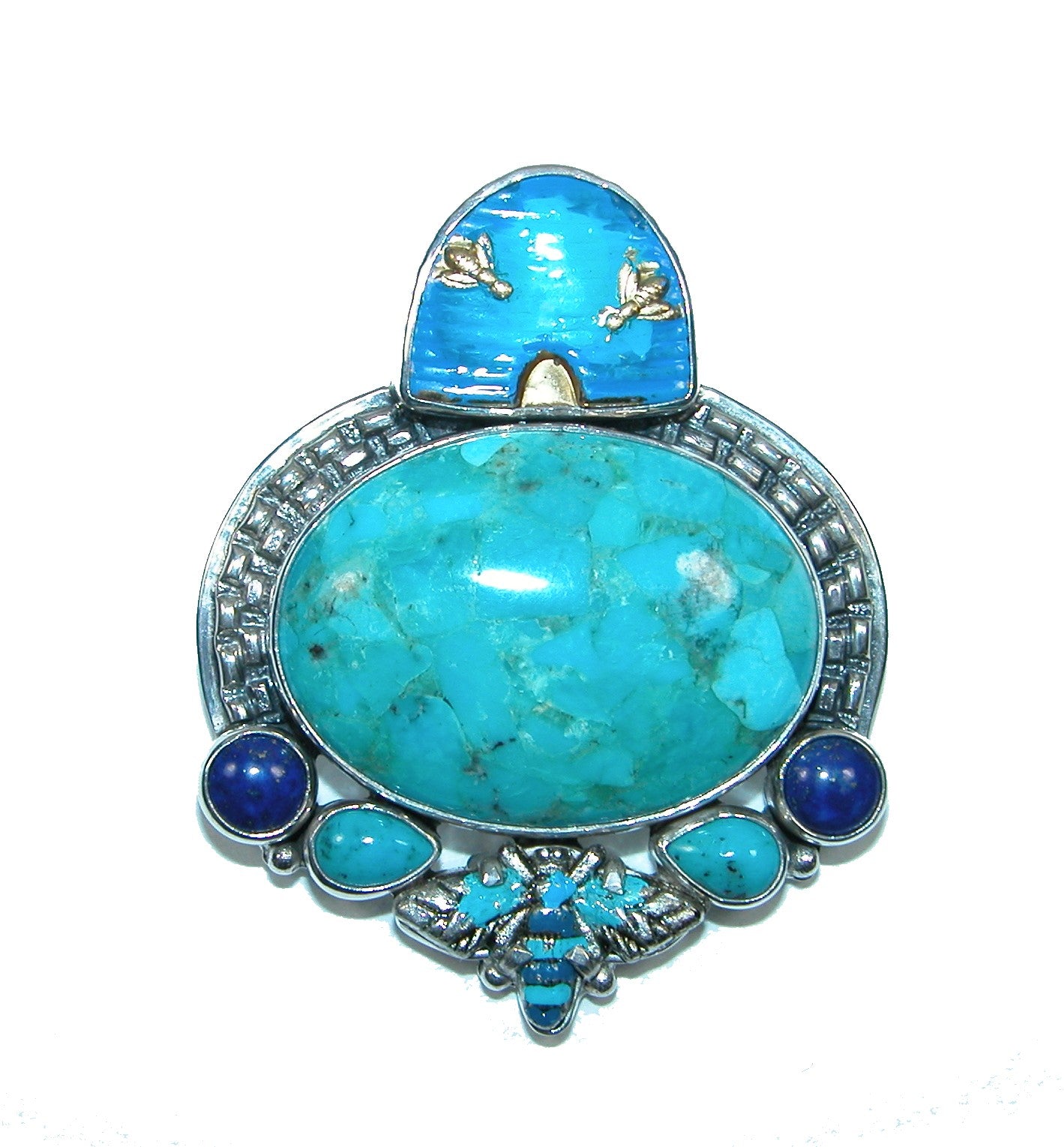 32285 Hand Enameled Beehive with Turquoise and Lapis Sterling Silver Pin Pendant