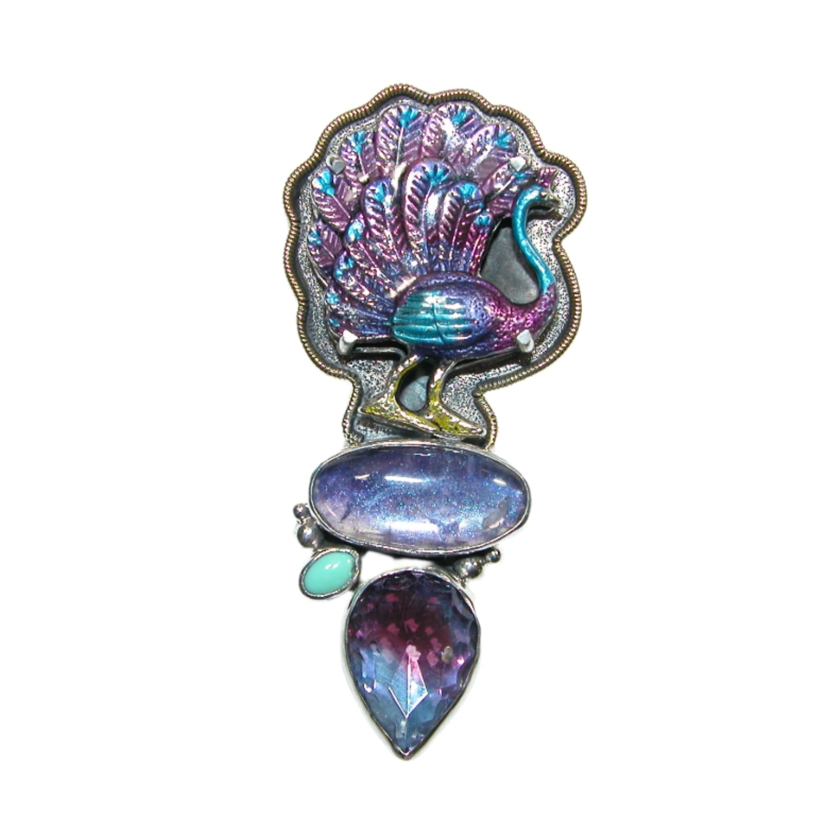 33057 Hand Enameled Peacock Sterling Silver Pin and Pendant