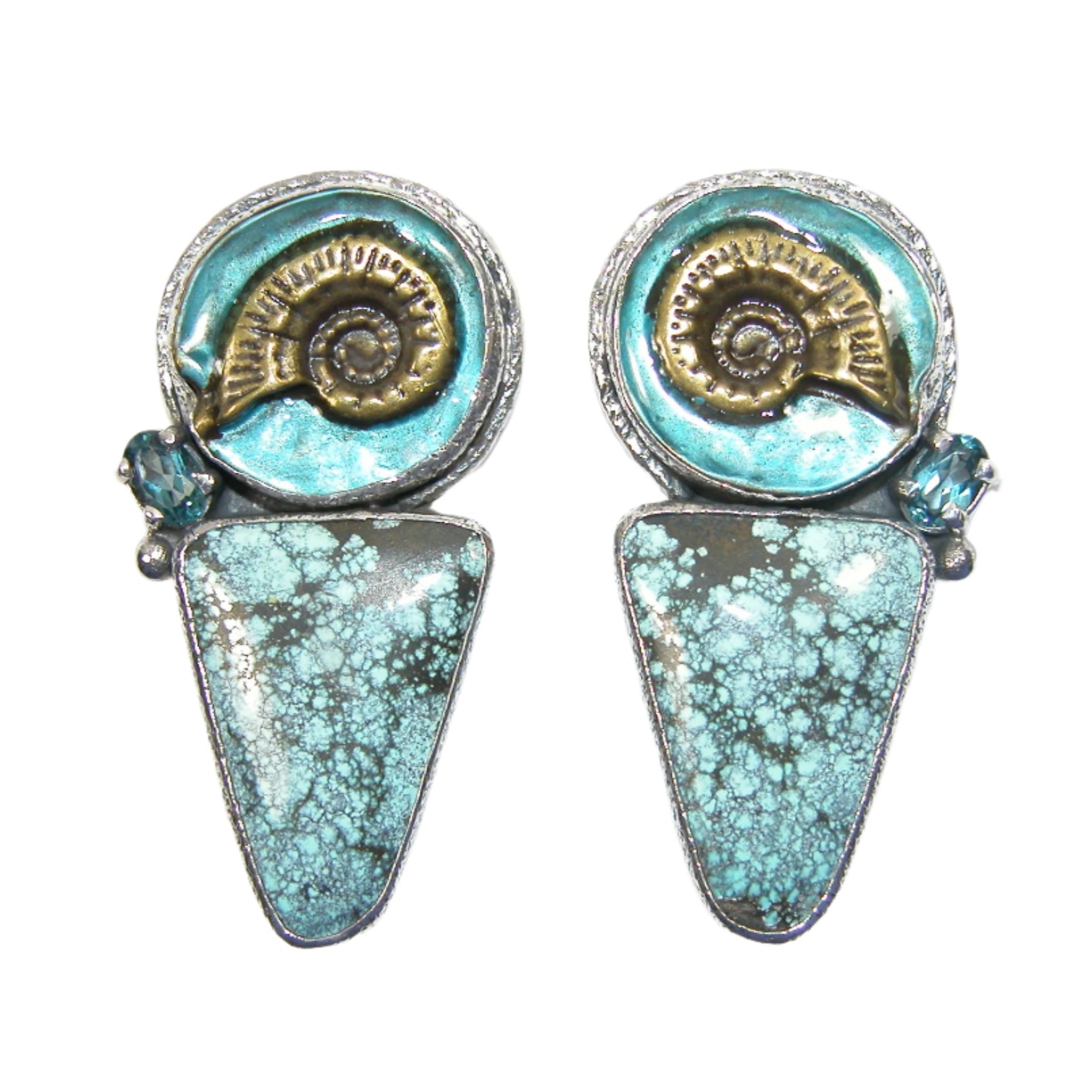 33470 Hand Enameled Shell with Blue Topaz and Turquoise Sterling Silver Earrings