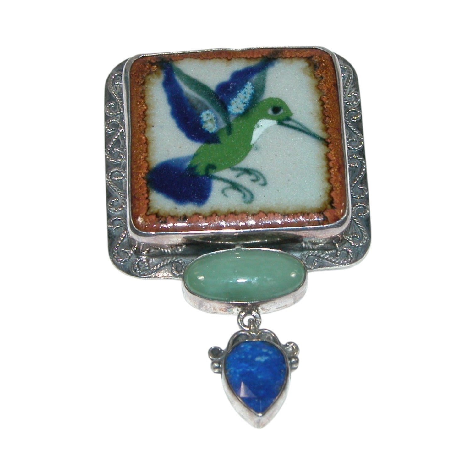 20973 Hand Painted Ceramic Bird Aventurine, Lapis Sterling Silver Pin Pendant
