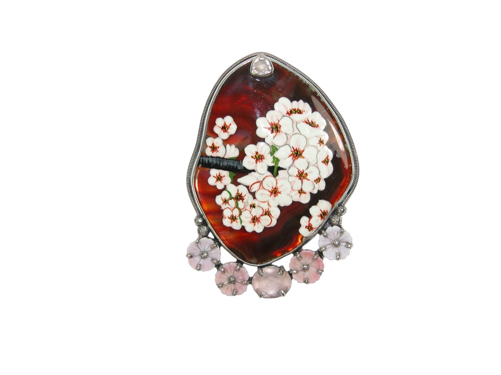 33631 Hand Painted Flowers on Agate with Carved Mother of Pearl Flowers Pin Pendant