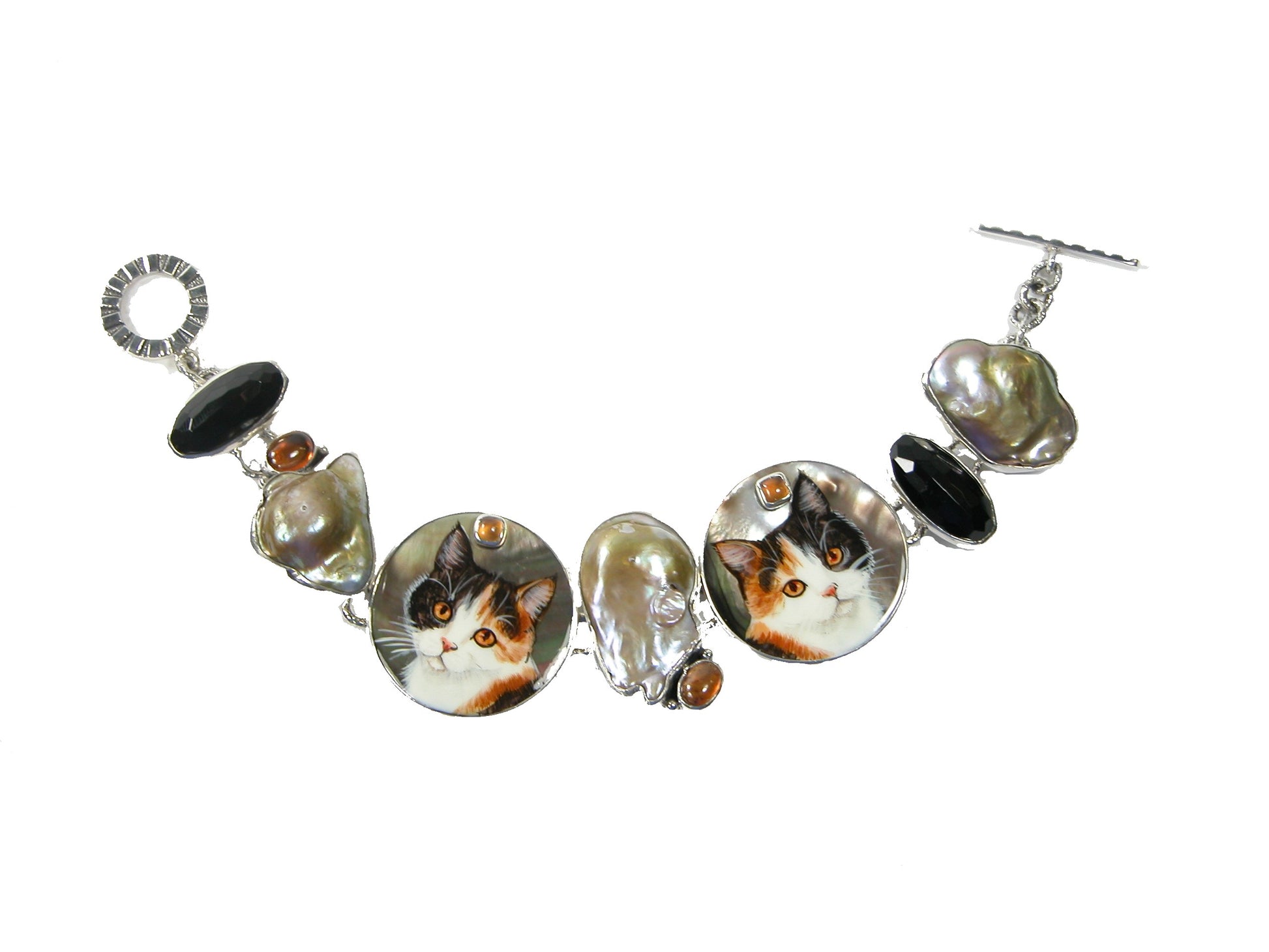 Hand Painted Miniature Mother of Pearl Black Onyx Amber Sterling Silver Bracelet