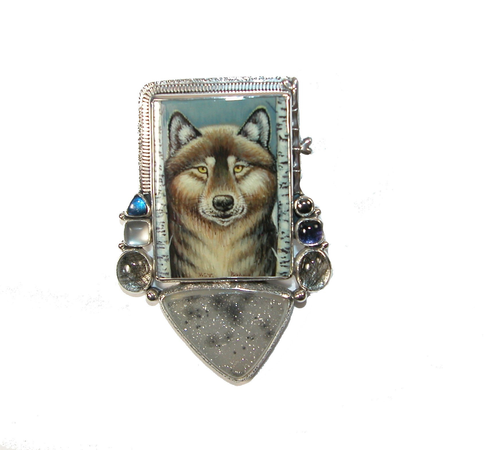 Hand Painted Wolf Drusy Sterling Silver Pin and Pendant