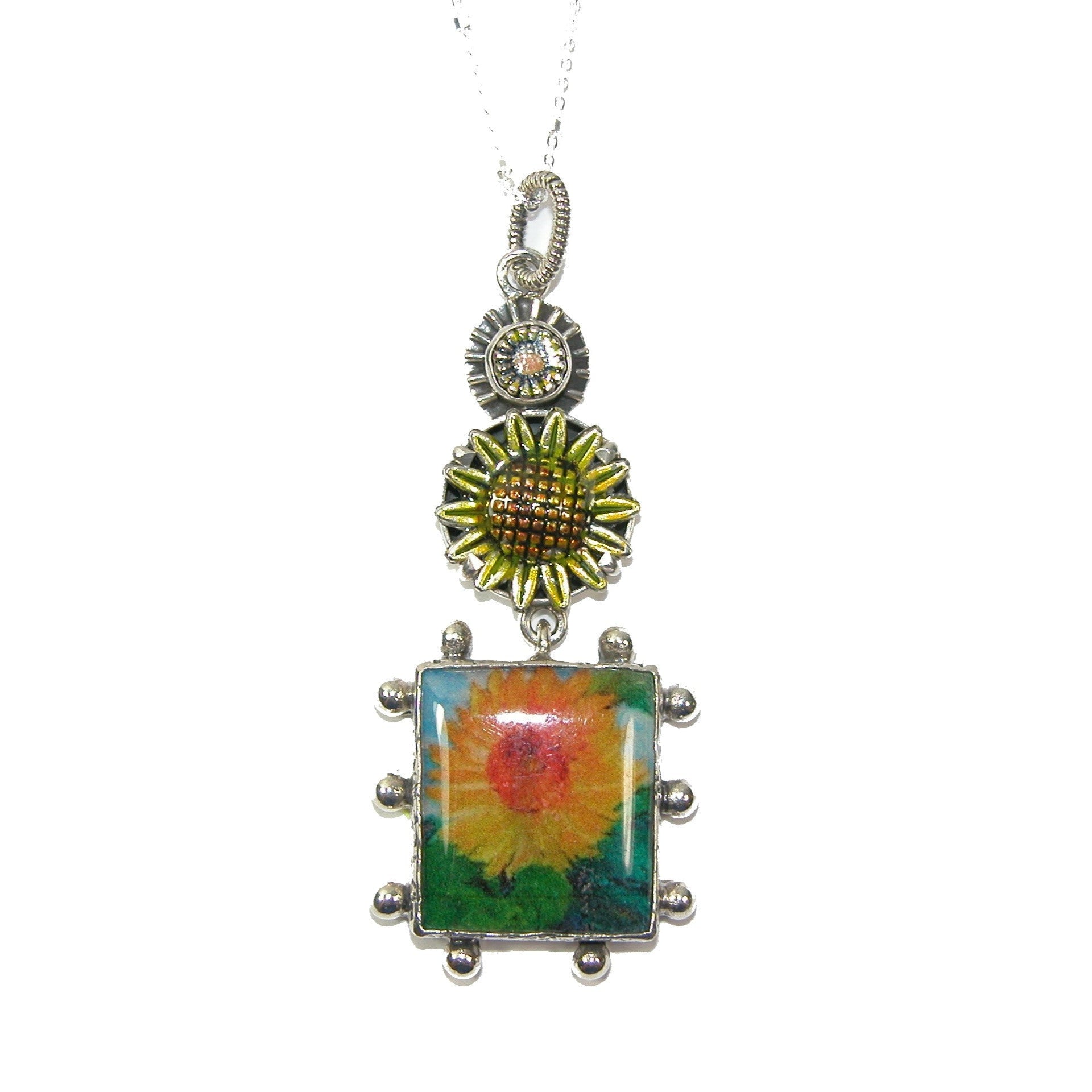 30264 Handmade Sunflower Tile Enameled Sterling Silver Necklace